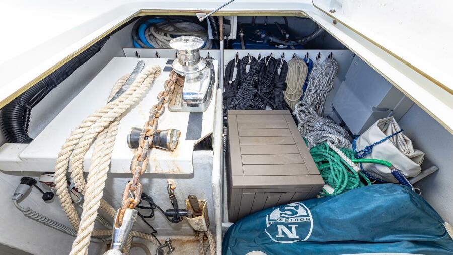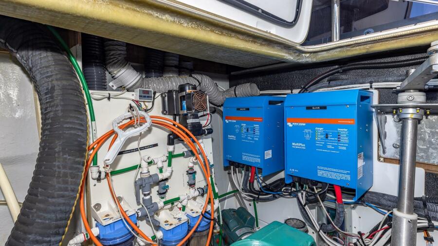 • Extensive backup and replacement parts including 2x engine exhaust elbows, chartplotter, auto pilot EDU, oil & fuel filters, watermaker filters, wind instruments, water pumps, cabin fans, inline exhaust fans, steering chain, and much more