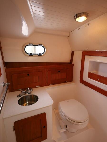 While most of us are looking to avoid rough water these days, the Surfhunter is famous for dancing right through it with a dry ride that must be experienced to be believed. With plenty of seating both in the cockpit and under the hardtop, there is room for three couples to ride in comfort while it is not uncommon at all to see a mix of ten aboard for a day. The unusually large ensuite head with shower is perfect for the primarily day-use the boat is designed for while the galley and generous Vee-berth with filler below are perfect for a couple to overnight with.