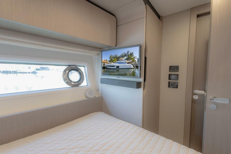 Inside, the salon is bright and modern with panoramic views, a full galley, and a seamless flow to the lower helm. Below, four well-appointed staterooms—including a full-beam master—provide generous comfort for extended cruising.