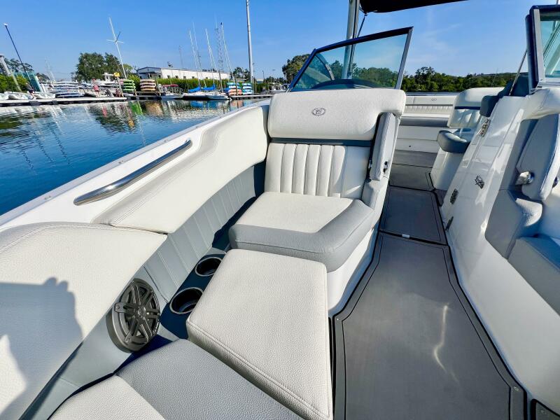 The 25SC features a thoughtful layout with tons of seating space for guests both forward and aft. The head compartment is larger than many boats in this size range, and in-deck and under seat storage offer plenty of room for gear and equipment.