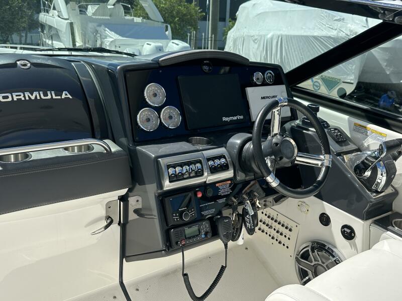 Introducing the stunning 2021 Formula 350 Crossover Bowrider OB, a remarkable blend of luxury and performance. With an impressive overall length of nearly 38 feet, this bowrider features a sleek fiberglass hull designed in a deep Vee shape, ensuring a smooth and stable ride on the water. Powered by three robust Mercury Verado 350 outboard engines, delivering a total of 1,050 horsepower, this vessel promises exhilarating speed and agility. The advanced joystick control enhances maneuverability, making it a breeze to navigate in any conditions. Inside, the boat offers a well-appointed cabin and head, providing comfort for day trips or weekend getaways. The thoughtful design and spacious layout make it perfect for entertaining guests or enjoying family outings. Experience the thrill of the open water with the Formula 350 Crossover Bowrider, where style meets performance in every detail.