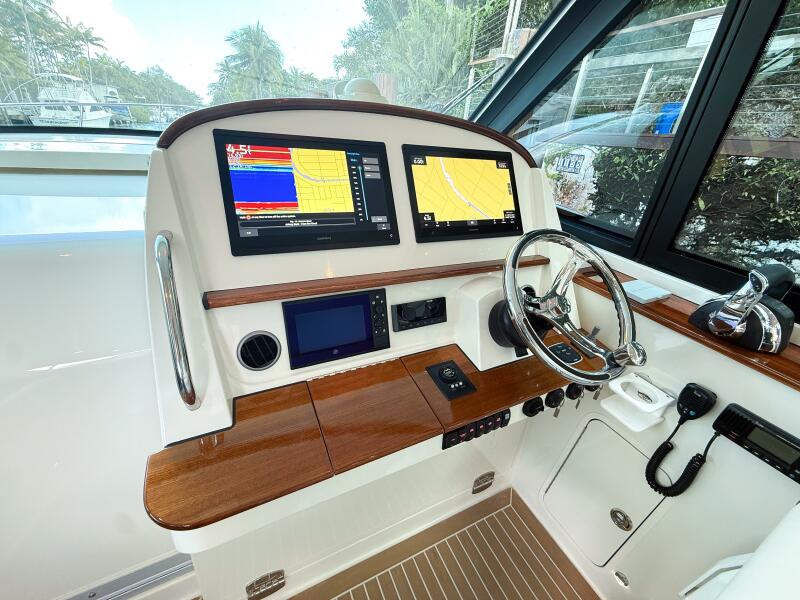 • Teak trimmed helm console with stainless steering wheel