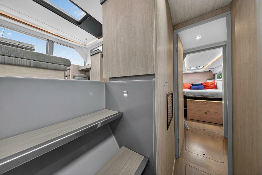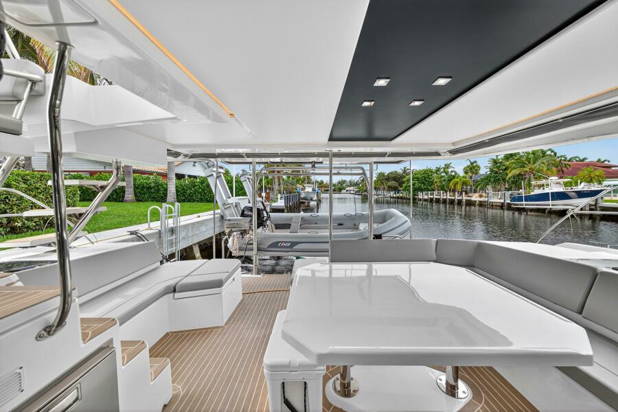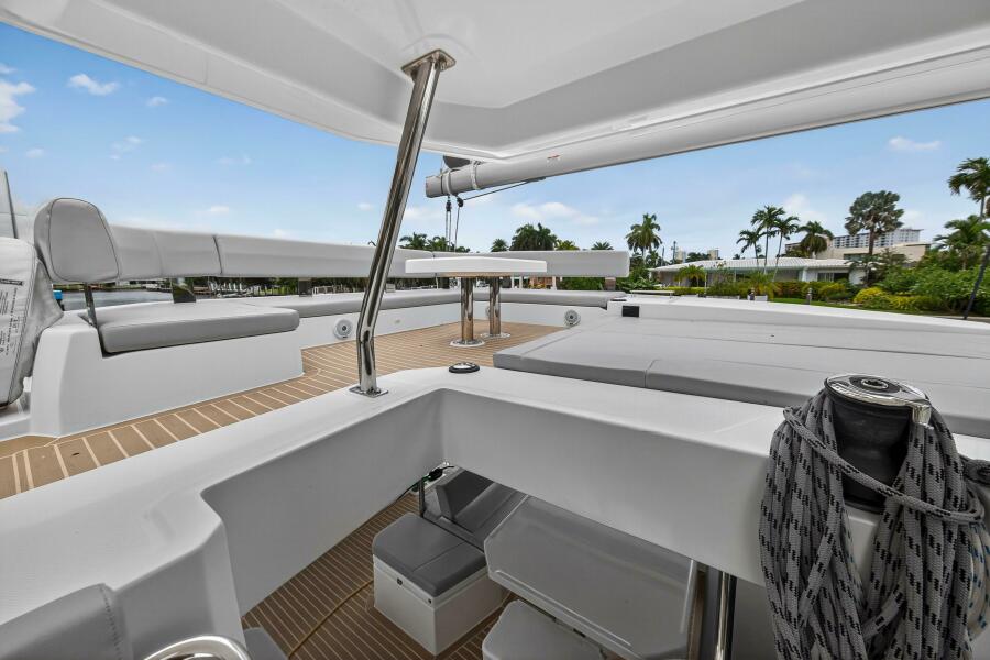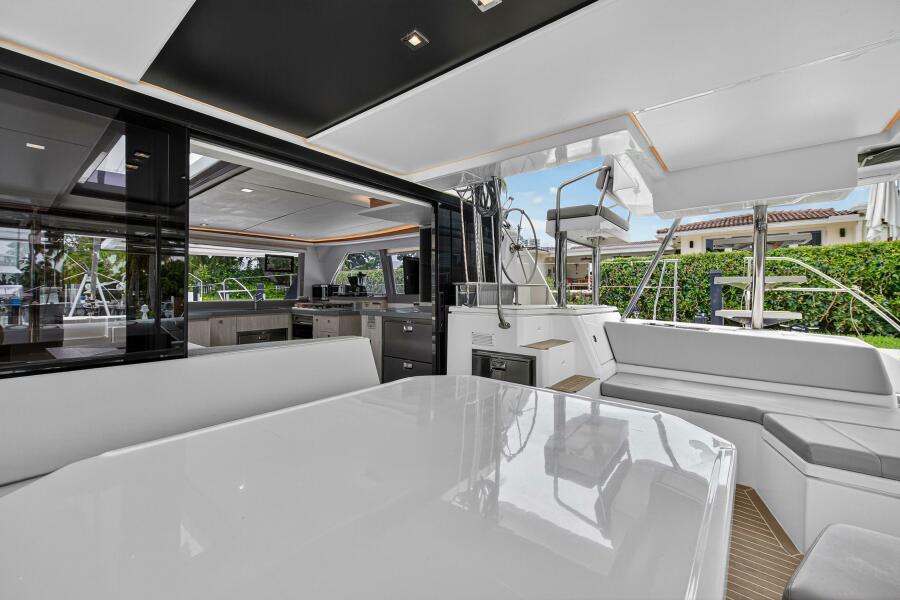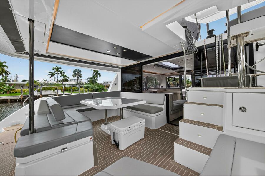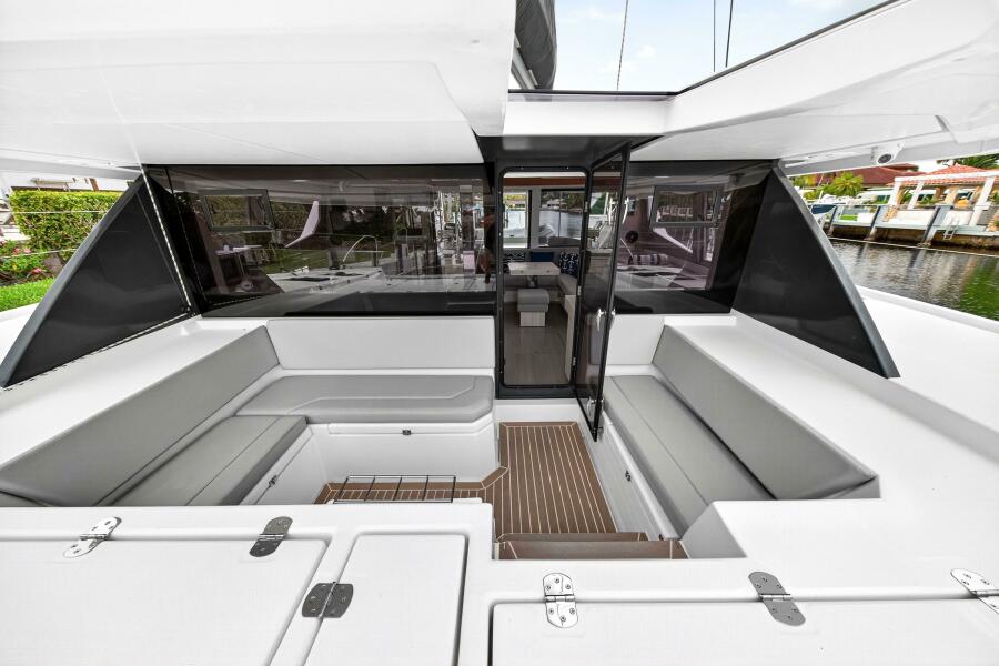 This lounge feature first launched on the award-winning Leopard 50 and like her big sister, the lounge on the Leopard 45 includes a seating area, a sunbed, and a table. Access to the lounge is provided by floating stairs leading up from the aft cockpit, without disrupting the helm station. The helm station remains well protected, and integrated into the cockpit and the rest of the boat.