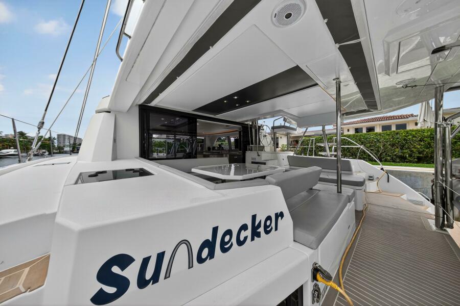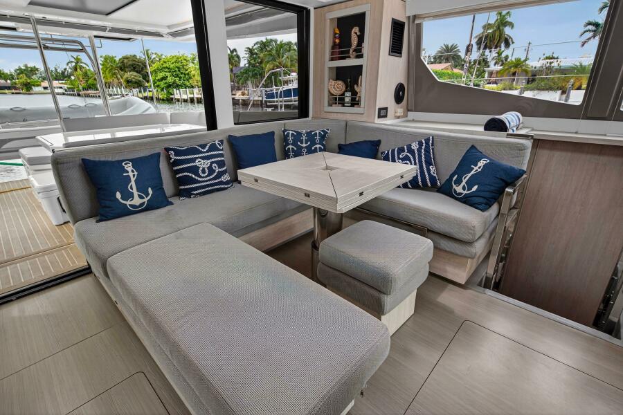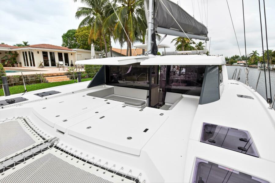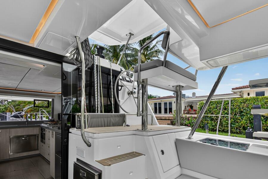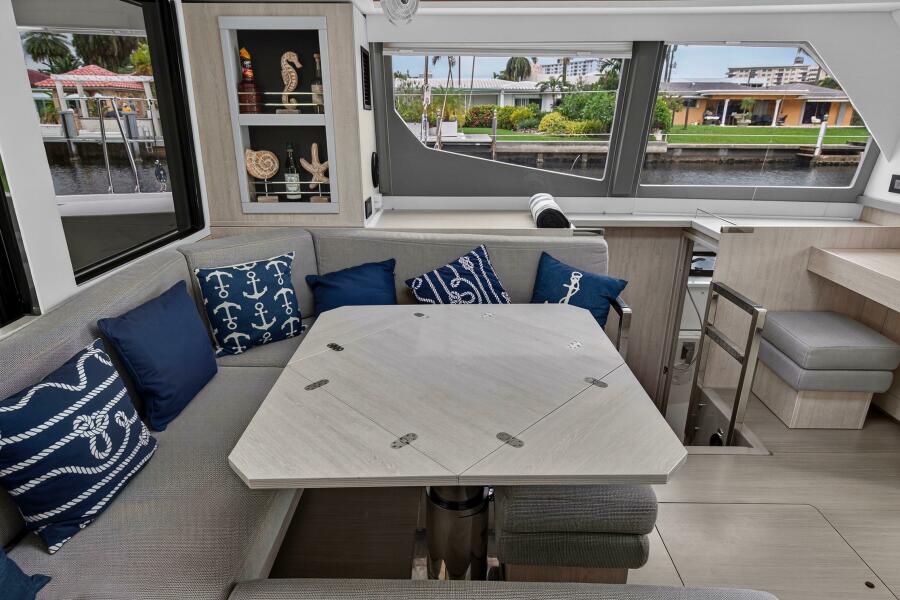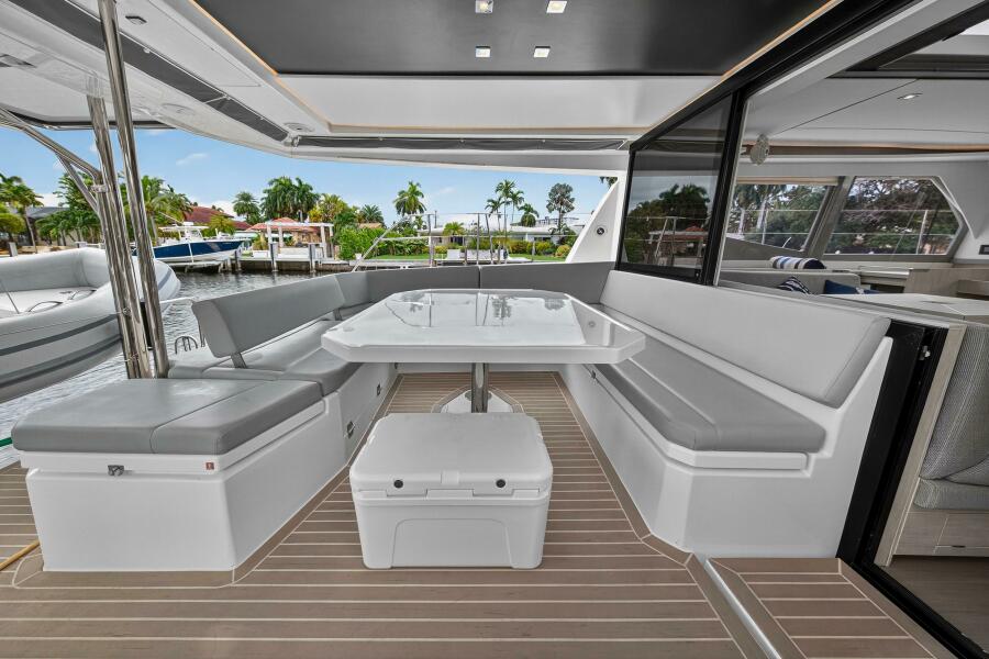 This lounge feature first launched on the award-winning Leopard 50 and like her big sister, the lounge on the Leopard 45 includes a seating area, a sunbed, and a table. Access to the lounge is provided by floating stairs leading up from the aft cockpit, without disrupting the helm station. The helm station remains well protected, and integrated into the cockpit and the rest of the boat.