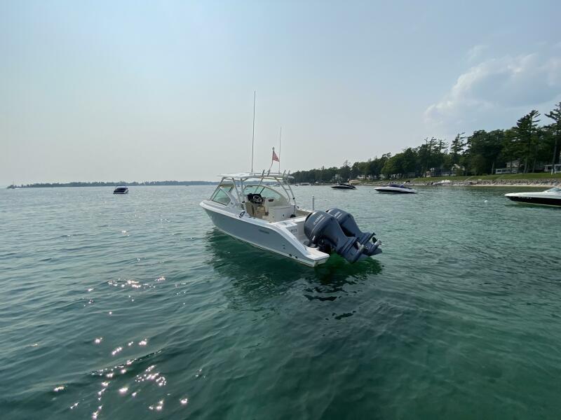 This 2021 Pursuit 266 Dual Console features a fiberglass hardtop, tempered glass windshield engineered with a vacuum infused fiberglass frame with roomy walkthrough and plenty of storage, the DC 266 has an LOA of 27' and is powered by dependable dual Yamaha Outboards. The adjustable helm seat allows for excellent access to the instrumentation and controls as well as the Garmin electronics. The exterior seating is complemented by the open bow design that has full wrap around seating with plenty of room for family and friends. Add the sun-pad option and the social zone quickly converts to a private oasis. A head and sink allow