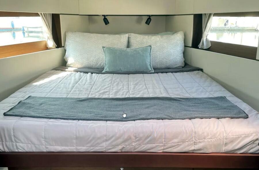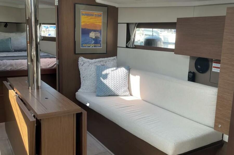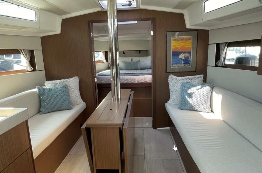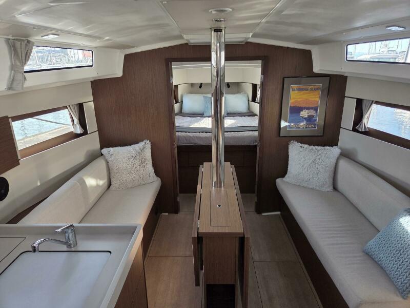 Huge aft berthGalley with fridge/freezer, microwave, stove/oven, sinkHead with toilet and sinkSeparate shower compartment2022 Beneteau Oceanis 38.1 foredeckCockpit with custom cushionsPort-side helm station with thruster, auto-pilot, engine panel, and B&G chart plotterCockpitNav station electrical panelNav station w/ table closedHull after bottom paintHull featuring keel jointBow thrusterFull Iversons enclosureCabin top and companion waySalonSalon starbard side seatingSpacious vee berth