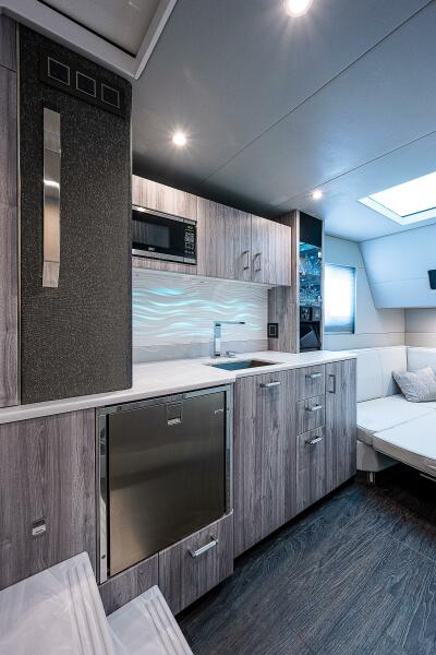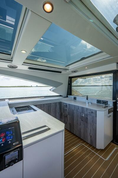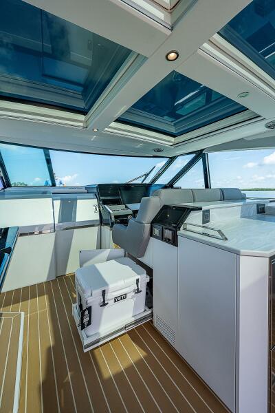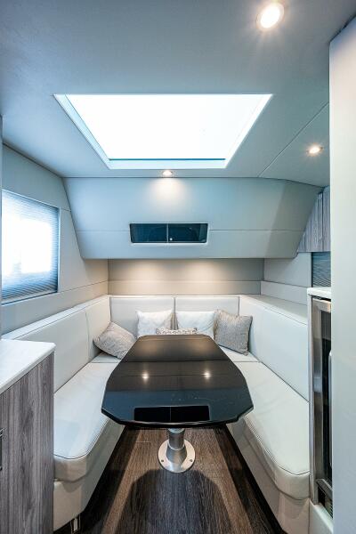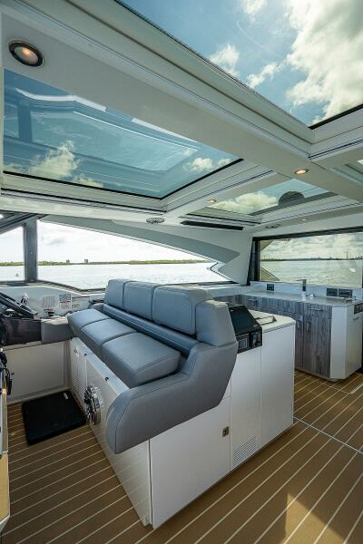 The 500 SSC is widely recognized as one of the most innovative luxury crossovers on the water—part bowrider, part express yacht, and entirely Formula. The spacious salon is fully enclosed beneath the sculpted fiberglass hardtop, with a full-width retractable glass bulkhead that allows the boat to transform from open-air to fully protected at the touch of a button—perfect for changing weather or extended cruising.