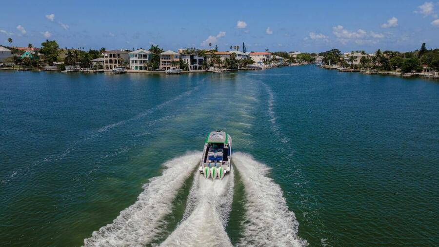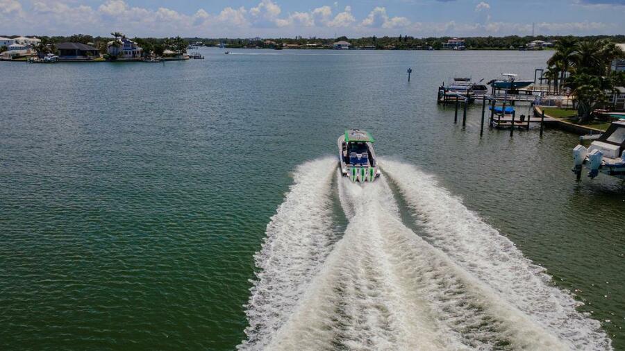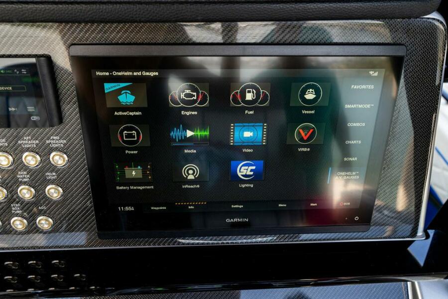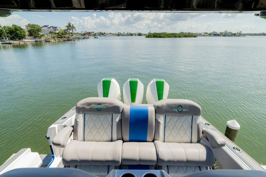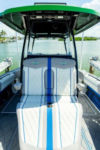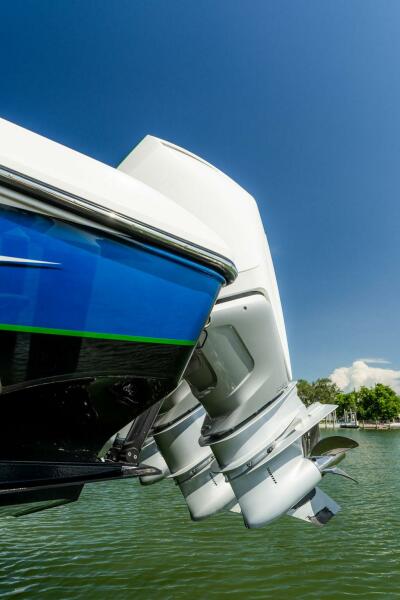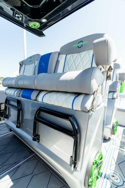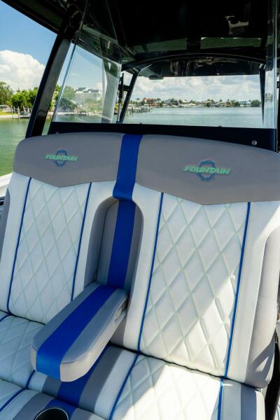 From the stand-up bolsters and full-width aft seating to the forward chaise lounges and recessed bow seating, the Fountain 34SC blends offshore capability with luxurious comfort. With its sleek styling, triple-engine power, and class-leading ride, this 34SC is equally at home running 70+ mph offshore as it is entertaining friends in the harbor.