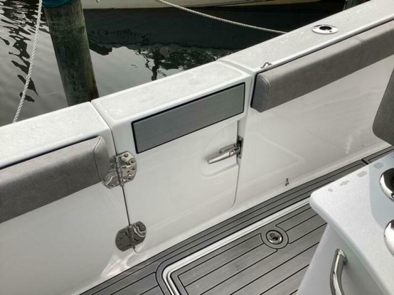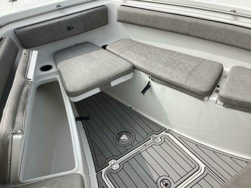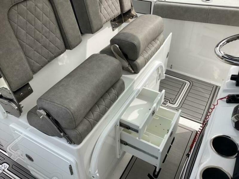 Make no mistake, fishing remains the priority. Aft, a pressurized 30-gallon livewell is centered at the transom, featuring a clear lid and rounded interior to avoid bait shock. Macerated fish boxes are found below the floor to both sides of the leaning post, and another insulated fish box awaits below the bow floor. Horizontal rod stowage is located within the starboard inwale. Thigh-high coaming bolsters wrap the perimeter. The leaning post, on our test boat upgraded to include LleBroc Billfish chairs with padded armrests and flip-up bolsters, features tackle drawers up front, nooks for knives and pliers, a cabinet portside with slide-out tackle boxes and an additional live well aft. The console features plenty of open space for a captain’s choice of electronics. Even the bow table favors fishing — it lowers to do double duty as a cast netting platform. For all the fishing focus, the 259 retains the ability to haul a crew in comfort. Aft, a cushioned bench folds out from its tucked-away position on the transom and features a backrest that rises and lowers. At the helm, those cushy Llebroc seats provide room for captain and passenger, and they add fold-down armrests. Forward, generously padded cushions snap in above all port and starboard storage lockers to provide bench seating. Slide-in backrests can be added for true forward-facing support and to let the crew stretch out in comfort. The seat on the front of the console also goes beyond the norm with a fully padded bottom and backrest, plus welcome grab handles integrated into the lid below.
