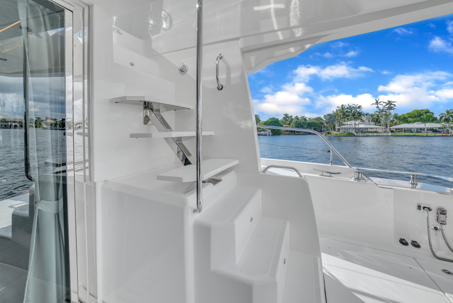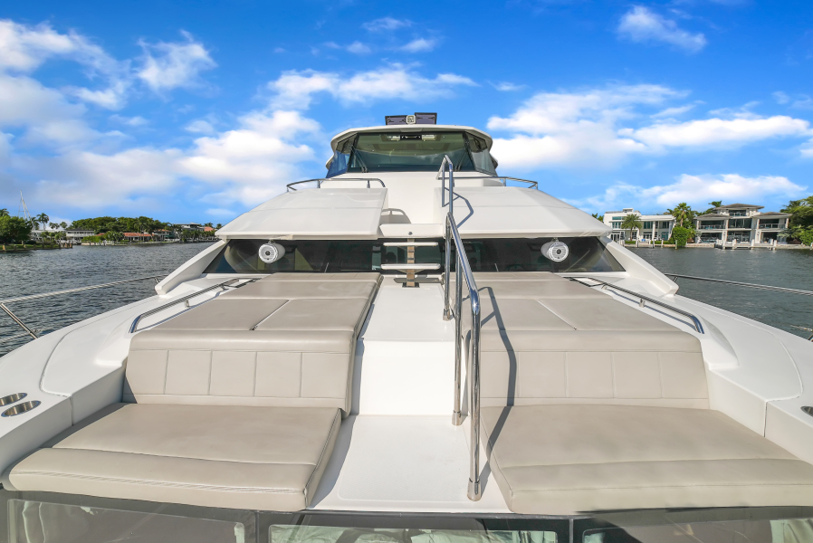 Fully enclosed flybridge Sky Lounge with upgraded furniture, upholstery & fabric to match salon; aft sliding door; side access door with additional access from interior stainless steel stairway in lieu of standard 5 panel tempered glass windscreen