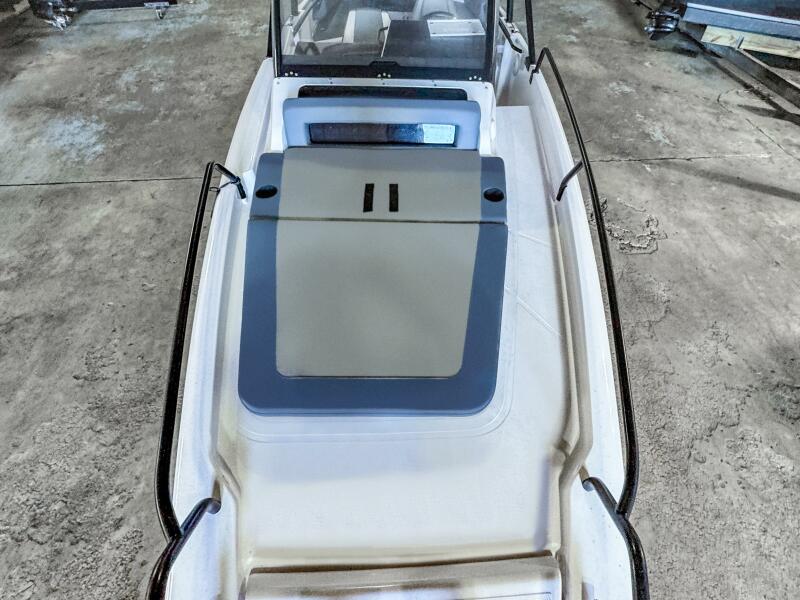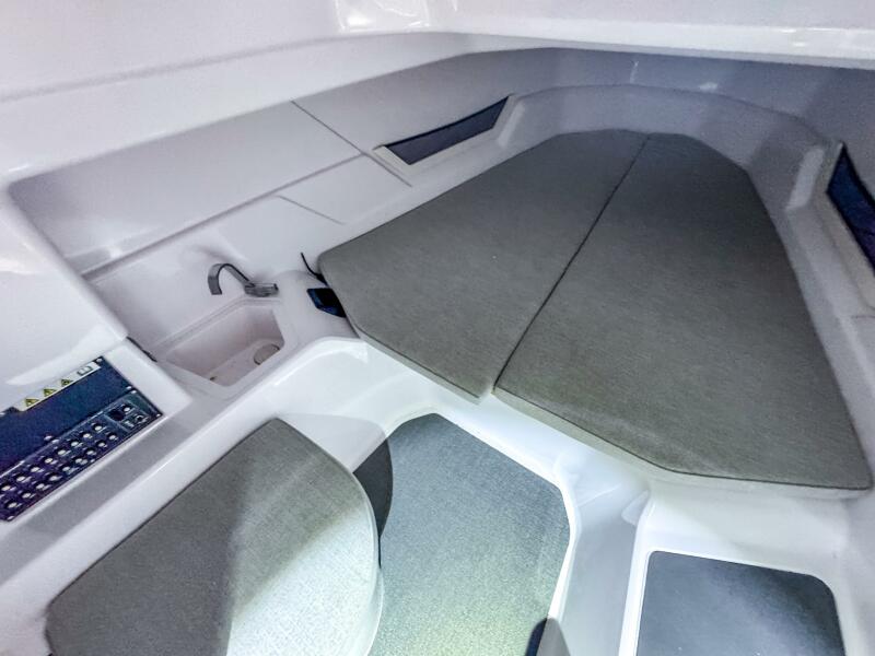 The helm is equipped with bow thruster, chartplotter Simrad NSS 12", Echo Sounder through hull, trim tabs, Steering console switch panel, and USB charging port. The wide helm console and front screen offer a helm seating area with more space and room for step through entrance to the front cabin in style.