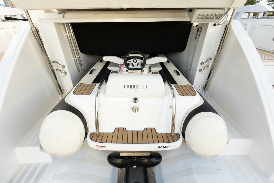 The exterior is equally impressive. The sport-flybridge offers panoramic views and a perfect space for relaxing under the open sky. The bow lounge is ideal for sunbathing, while the aft cockpit invites conversation over sunset drinks or alfresco meals. A hydraulic swim platform lowers to the water, providing easy access for swimming or launching the Williams 325 TurboJet tender stored in the garage.