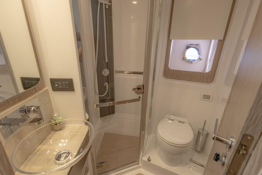 The salon welcomes you with refined materials, soft leathers, rich wood finishes, and an open layout that flows effortlessly from the galley to the lounging area. It is designed for relaxed entertaining, dining with friends, or simply enjoying the view at anchor. Below deck are three beautifully appointed staterooms, including a full-beam master suite that feels like a private retreat. A separate crew cabin ensures service is discreet and owners and guests enjoy complete privacy.