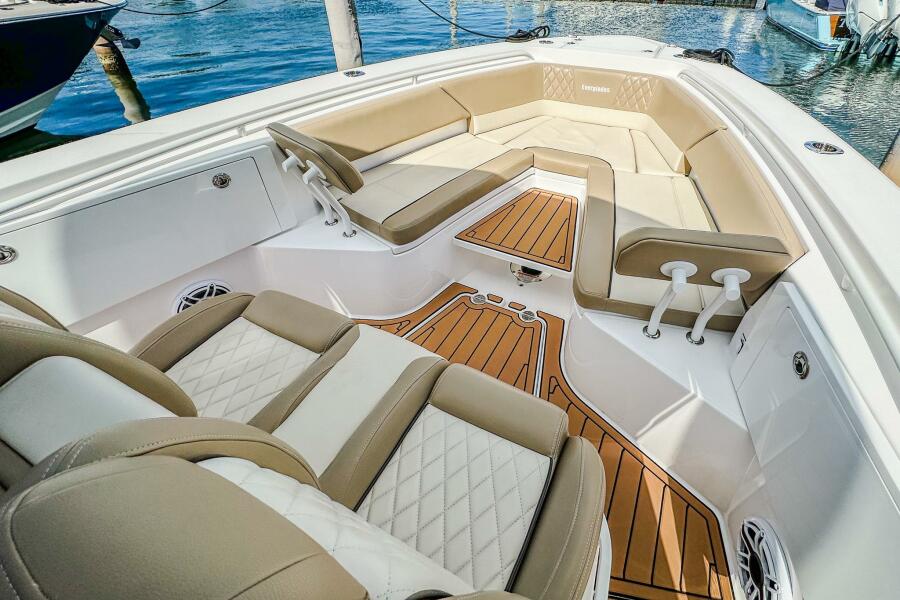 In addition to its abundant amenities, the 335cc continues Everglades Boats’ commitment to fishability. It’s larger console and hardtop, plus the bigger built-in coolers and fishbox storage allow for any fisherman to drop a line with ease.