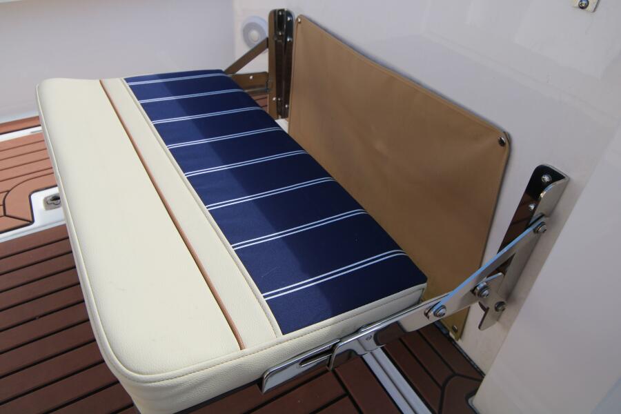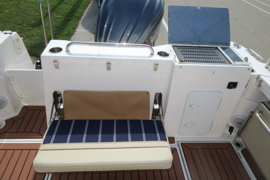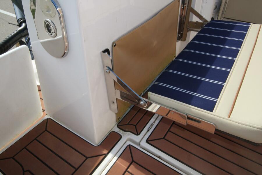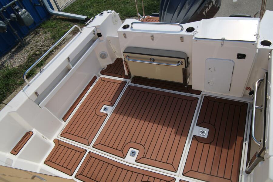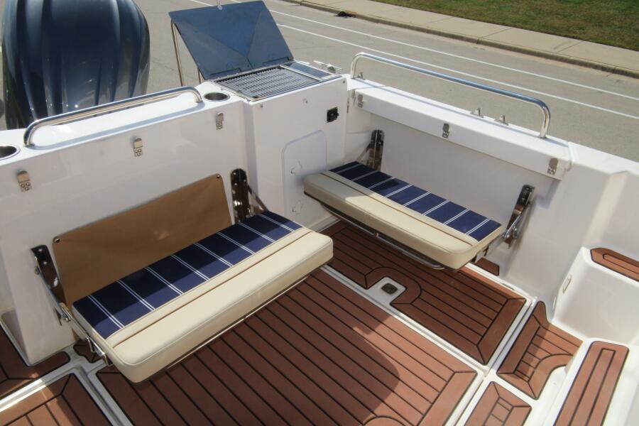 The R-25 has the wrap around swim platform that safeguards the outboard motor. The wrap around swim platform presents a clear walkway, free of all engine rigging which opens a whole new world of fishing, cruising, and water-sports opportunities. This exciting area allows you to safely and easily board a dinghy, net a fish, step to or from a low dock (important for pets), and easily med-tie without fear of damaging your outboard and having to leap to the dock.