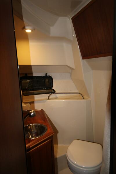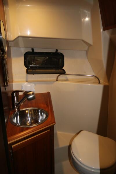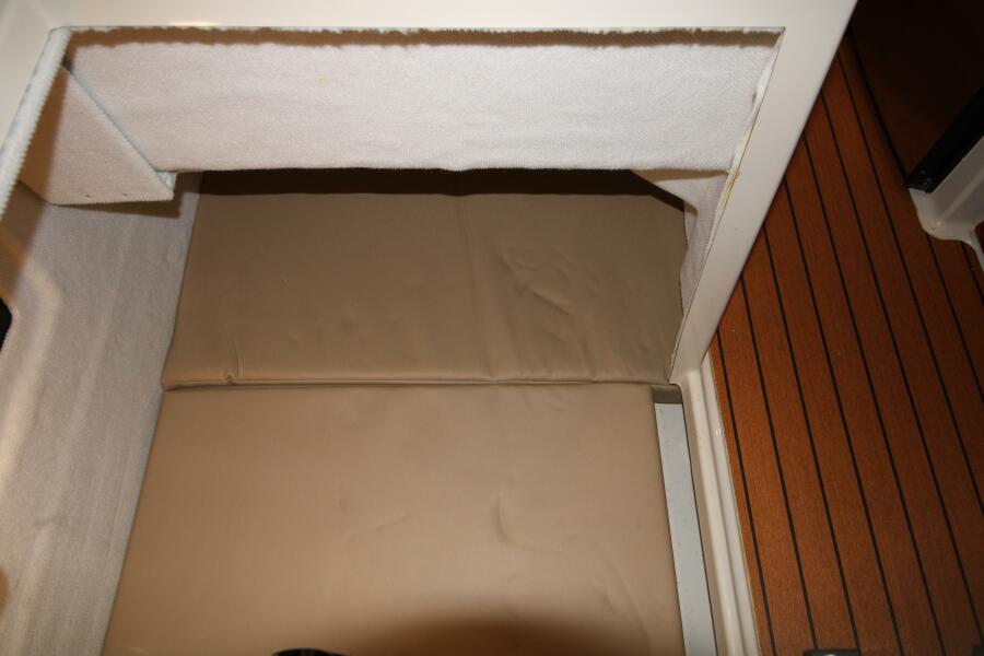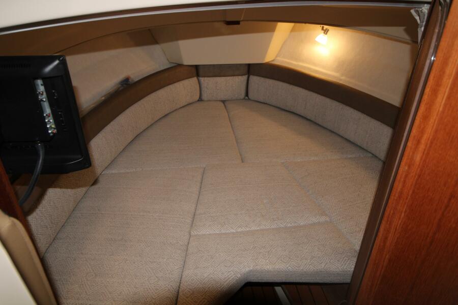 The forward stateroom is private and comfortable featuring a large v-berth/table sleeping area. Overhead hatches for airflow, reading lights, and a TV provide comfortable accommodations. Abundant storage under the berths are finished and also provide easy access to the bow thruster for shear pin maintenance.