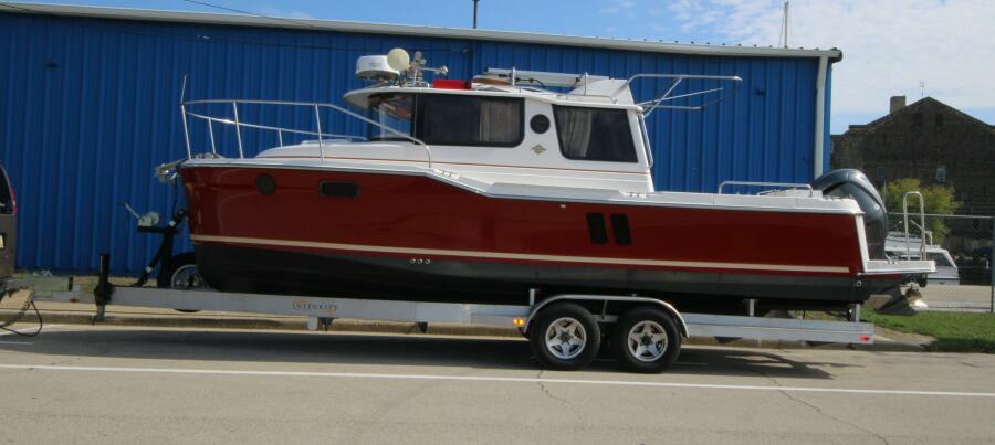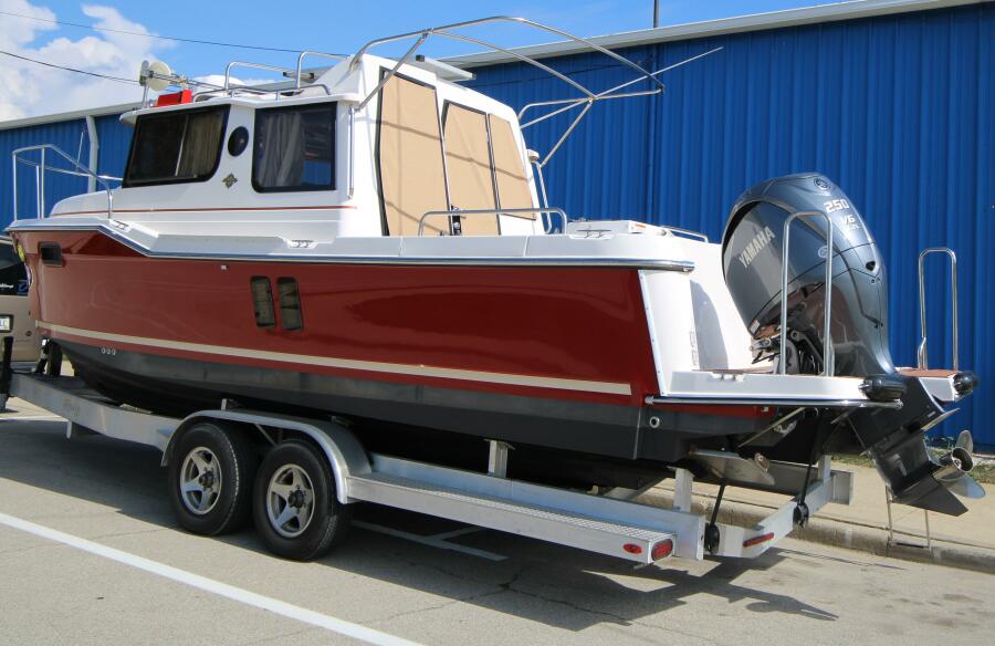 This R-25 with only 9 hours on the Yamaha F250XSB outboard is a feature-packed, trailer-able cruising yacht designed for comfort, ease of use, quality and fun. Well Optioned with Radar, Auto Pilot, Electric Grill, Bimini and Sunshade Extention, Hero Red Hull Color, and Lithium Battery Package with Air Conditioning, Inverter and Solar Panel options. Also this boat has been Epoxy Barrier Coated and Bottom Painted!