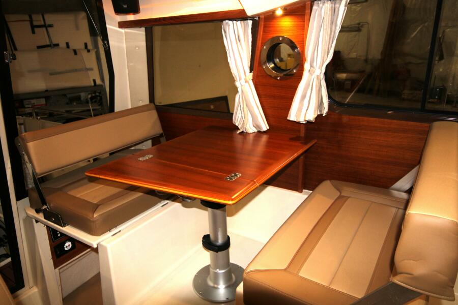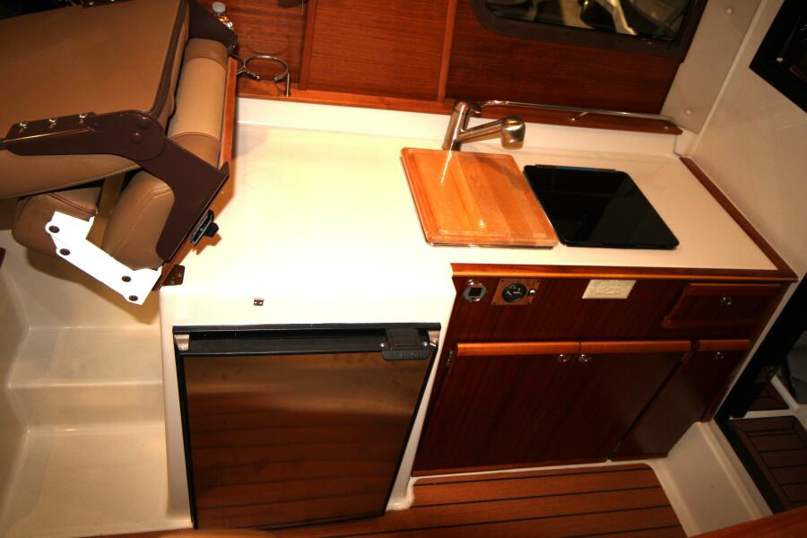The main salon on the R-25 is light and bright with overhead hatches and glass atrium skylights making it a perfect spot to relax or entertain, with 360 degree views. The dinette seats four or converts to a pit couch/bed. There’s even a storage/sleeper quarter berth with a removable mattress that can be used to accommodate guests/kids/pets or for expanded storage. Galley includes electric burner and microwave with Stainless Steel Sink offering hot/cold water making meals convenient. An refrigerator/freezer is also in the galley and convenient to the dining area.