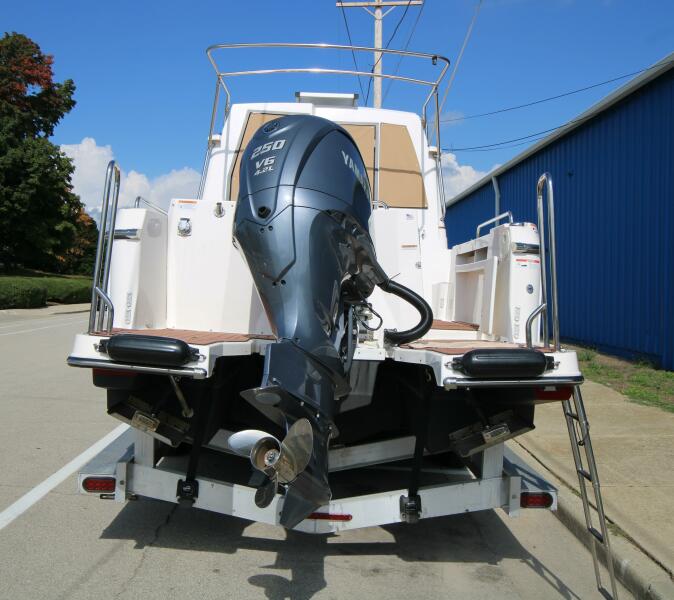 This Ranger Tugs R-25 has the custom built Integrity Aluminum bunk trailer that provides centering and load bunks; LED Submersible lighting; Sealed hubs, full size trailering tires on aluminum custom wheels; Brakes on both axles; Full size spare and rim mounted to trailer.