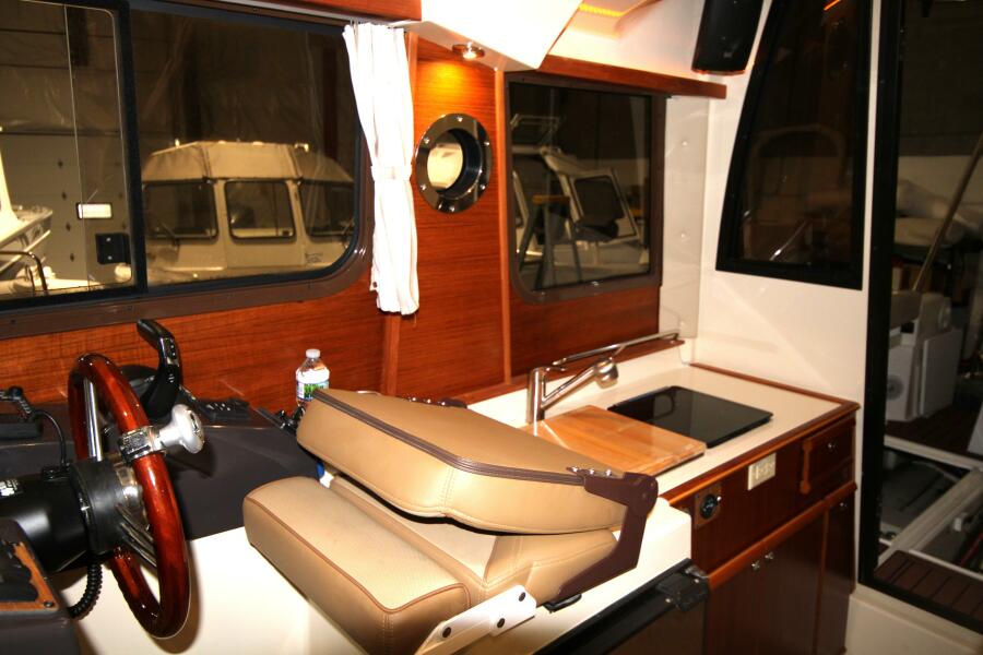 The power of the 250 HP Yamaha is perfectly matched to the R-25’s planning hull. The R-25 hull design features Ranger Tugs patented Laminar Flow Interrupter technology providing smooth, positive cornering performance and lower speed planing than other boat hull designs for maximizing fuel economy. Garmin 1242xsv chartplotter with GPS, transducer, and sonar and on this boat also Auto Pilot, Radar additional options provide excellent cruising electronics day or night.