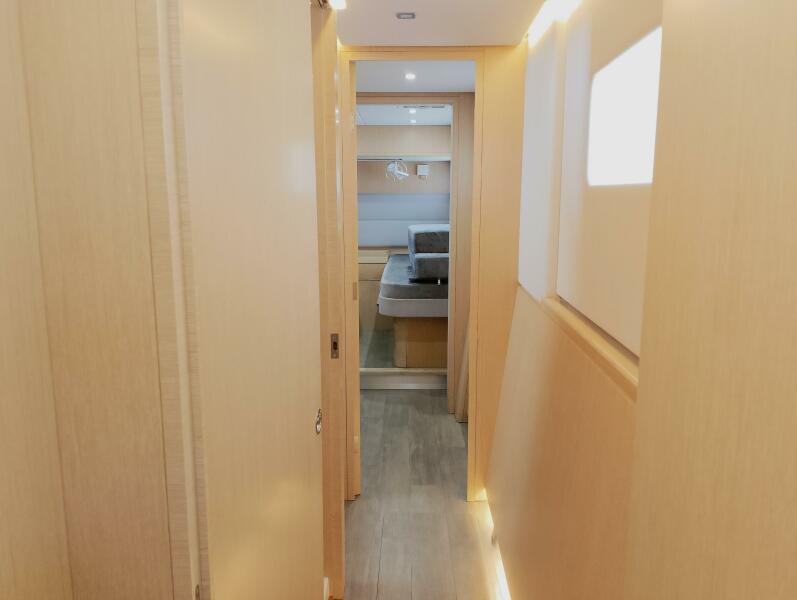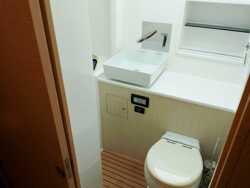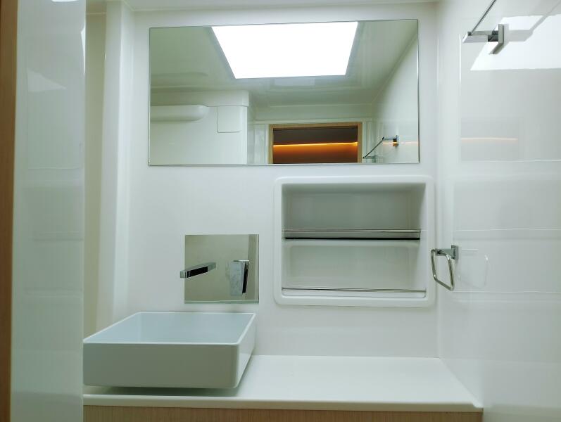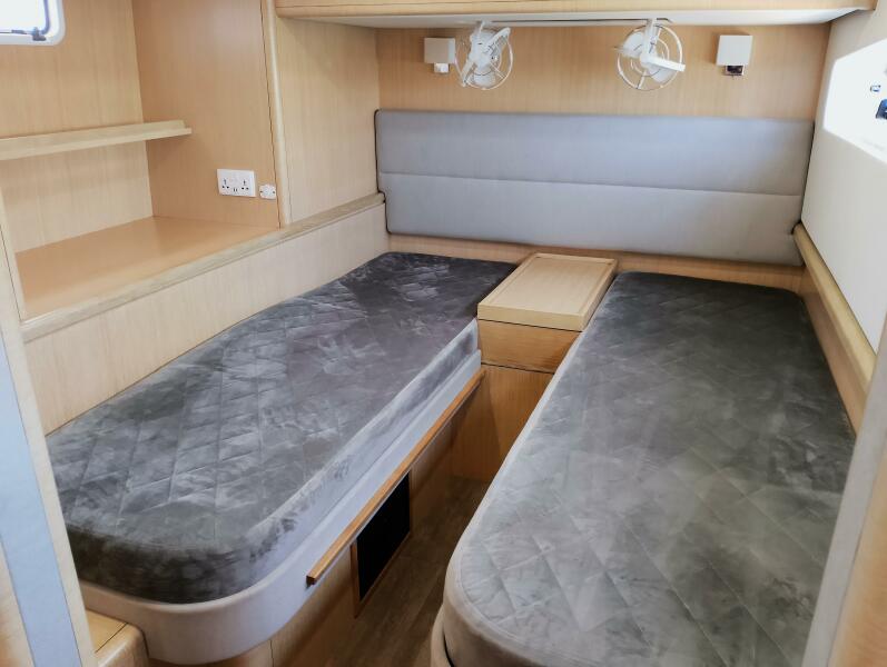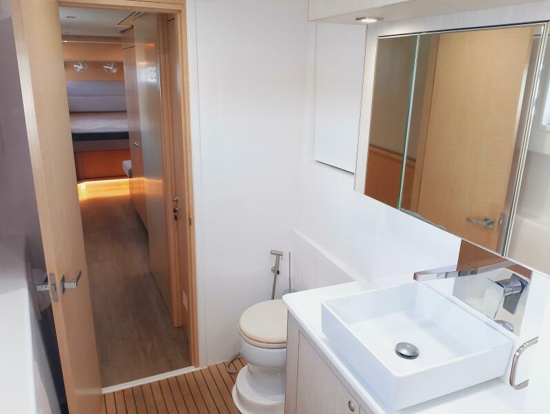 Bei Sogni features a thoughtfully designed owner’s layout, dedicating the entire starboard hull to a private suite. This includes a queen-sized island bed, generous storage, and a stylish en-suite bathroom with walk-in shower. The port hull accommodates guests in two well-appointed cabins with a shared head, providing comfort for extended cruising with family or friends.