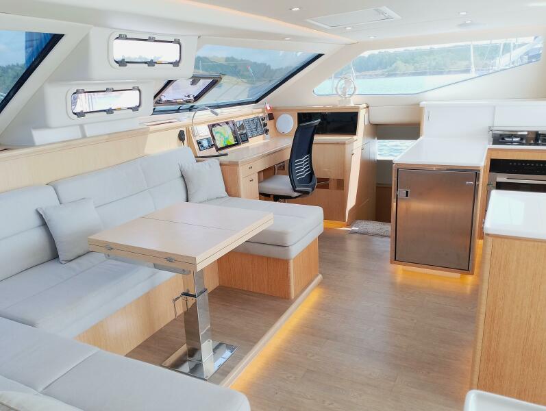 The interior showcases Seawind’s commitment to quality craftsmanship, with lightweight foam-cored construction, light oak finishes and modern walnut flooring that create a bright, contemporary feel. Indoor and outdoor living flow seamlessly, thanks to a large sliding saloon door and window that open to an expansive cockpit with seating for eight and a large dining table under a sturdy hardtop bimini.