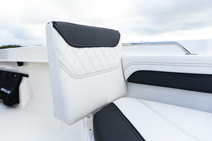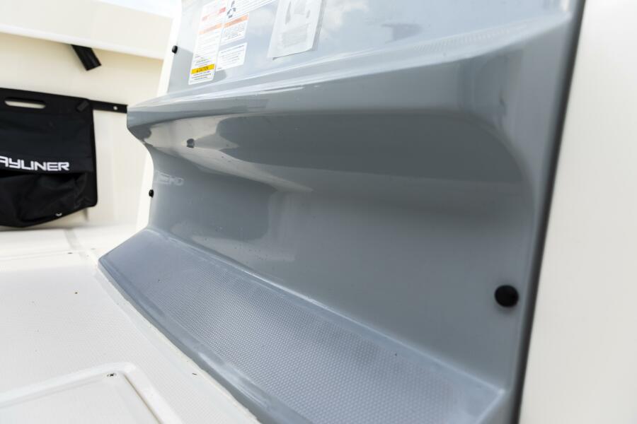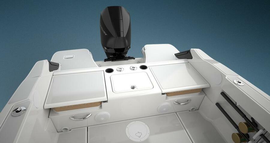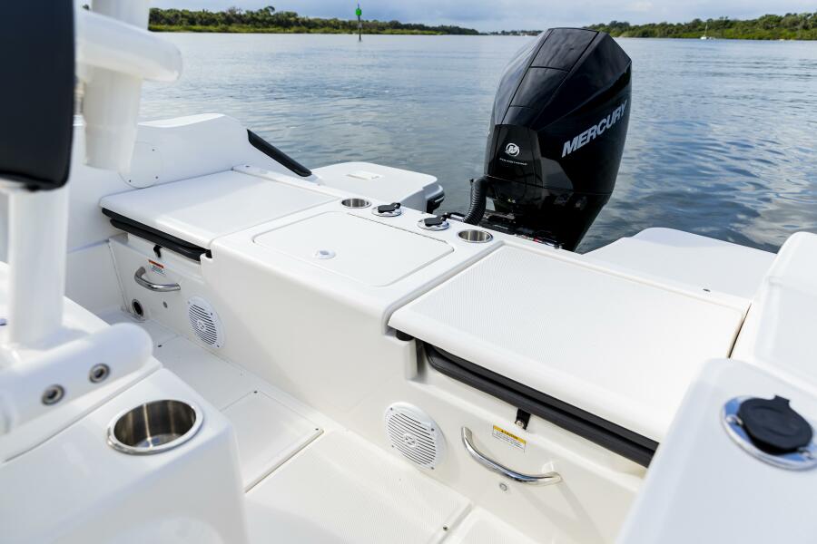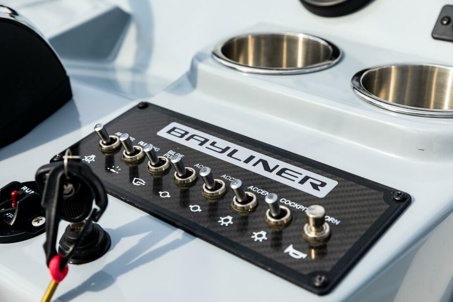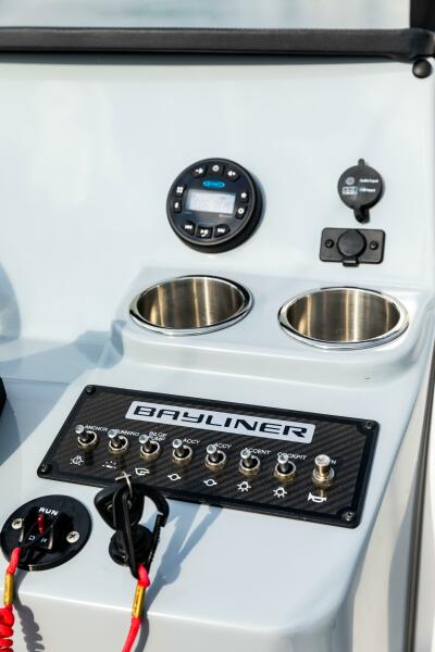Standard amenities include a self-bailing cockpit, a leaning post with an aerated livewell, insulated fish boxes, and gunwale rod holders. The cockpit is equipped with a waterproof 120-watt AM/FM stereo with Bluetooth capability, and the helm features multi-function gauges with fog-resistant glass lenses. With its combination of fishing features and family-friendly design, the Bayliner Trophy T22CC is an excellent choice for those seeking a well-rounded boating experience.