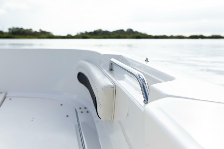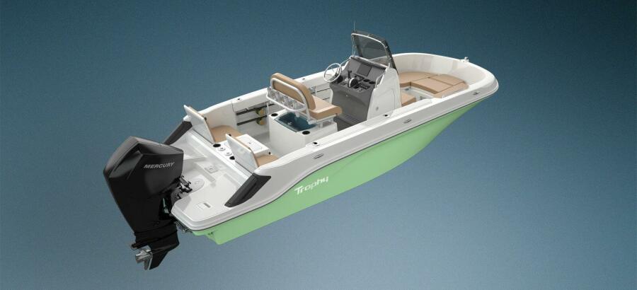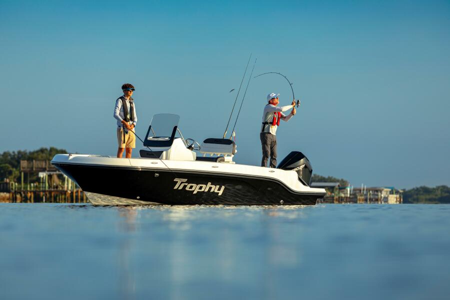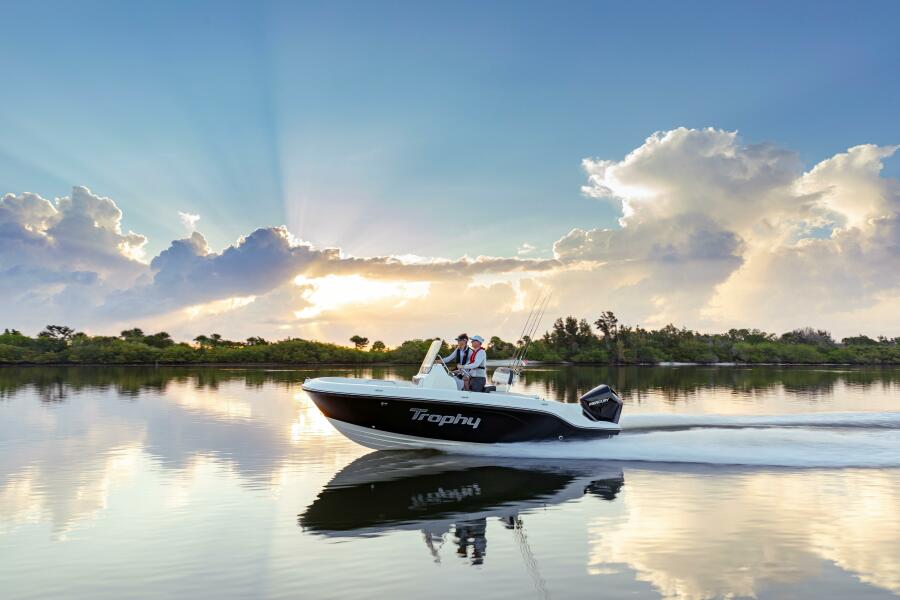 The 2024 Bayliner Trophy T22CC is a versatile center console boat designed for both fishing enthusiasts and families seeking recreational activities. With an overall length of 22 feet 7 inches and a beam of 8 feet 6 inches, it offers ample space for up to 10 passengers. The boat features a deep-V hull with an 18-degree deadrise, ensuring a smooth ride in various water conditions.