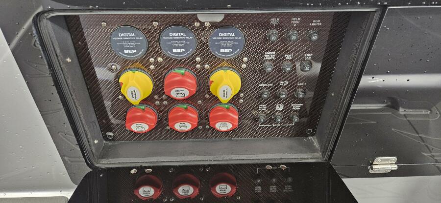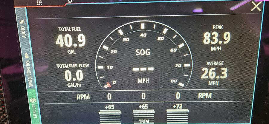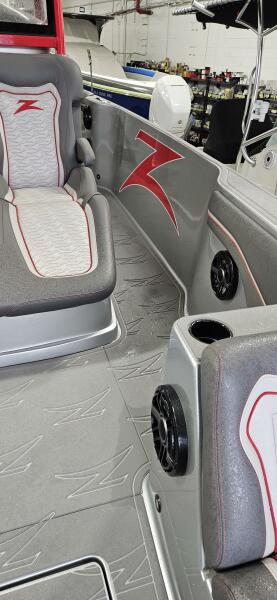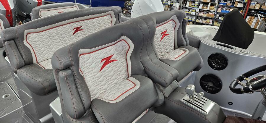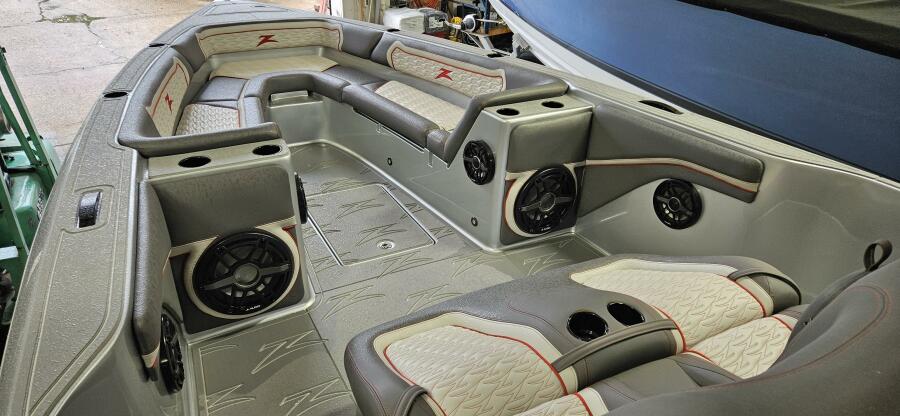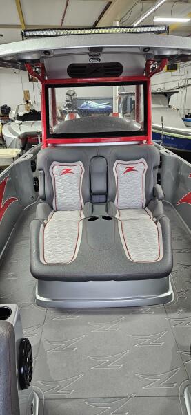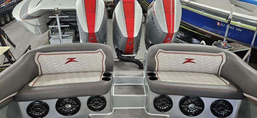 Cruises nicely in the 45-50 mph and will run north of 80 at WOT. This is a very cool piece and loaded with options such as custom paint inside and out, forward lounge seat with storage, 2nd row seating, center helm bolster w built in throttle/binnacle, rear electronic sureshade, custom made full cover ( as seen in the photos ) powdercoating option, led cupholders, folding footrest, upgraded JL audio pkg, underwater lighting, lithium battery pkg, transom shower, stainless windlass, STR jackplates, bow thruster and much much more !!