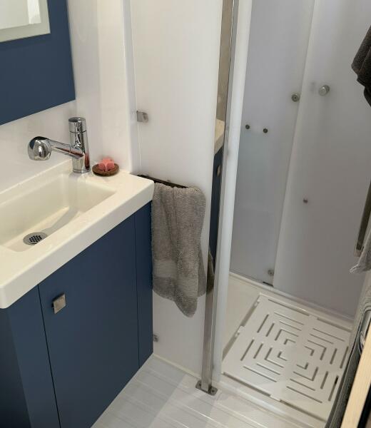 Interior enhancements include extra towel rails and holders, a cupboard above the starboard stairs, and an additional electric freshwater pump. Hot water capacity is 80 L, and the holding tank holds 200 L.