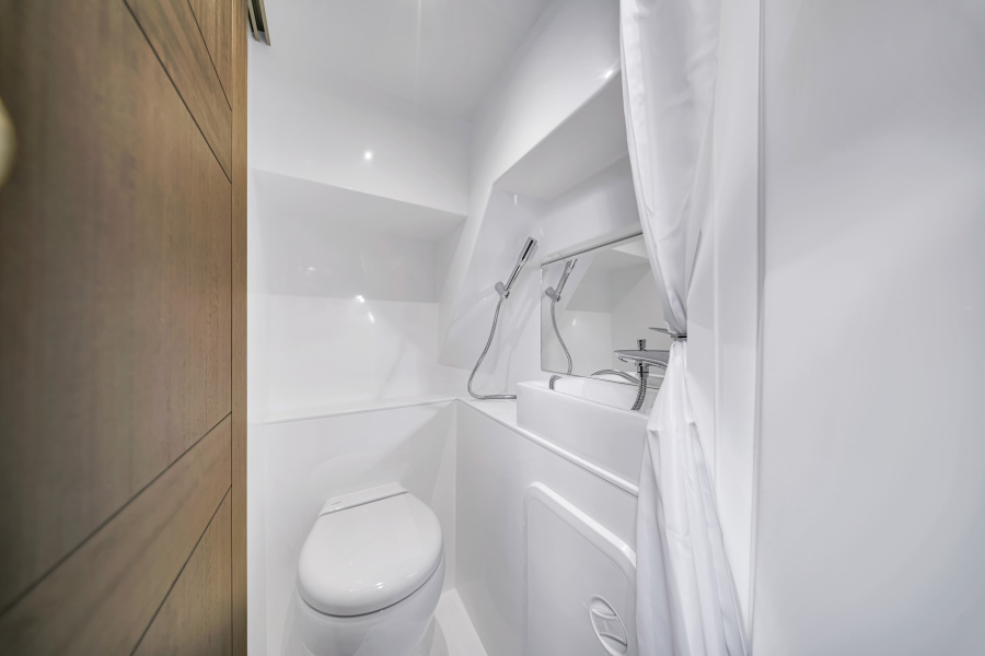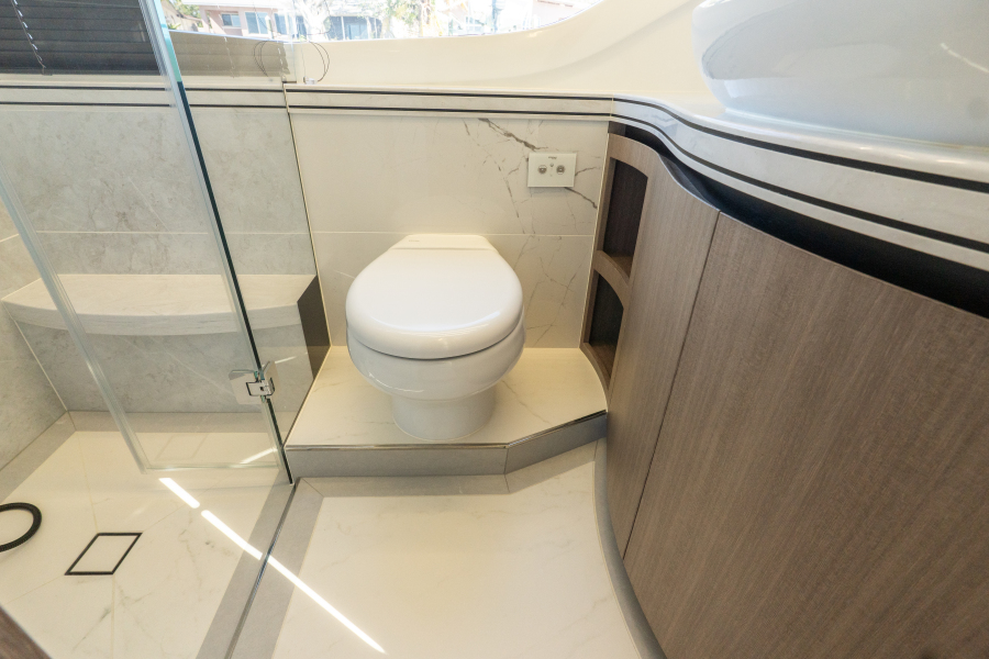 Luxurious Interior: Matte Lati Grey wood finishes, ambient LED lighting, wood-effect flooring, backlit cabinetry, and high-end audiovisual gear including 50″ motorized LED TVs in both the saloon and master suite.