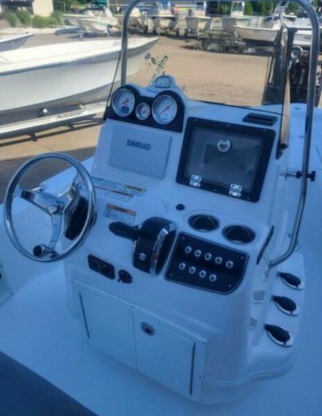 The 194 Bay is a hard-charging boat that gets out of the hole quick with a Suzuki 140 outboard. Its creature comforts includes two rear fold-down jump seats and an aft swim platform with an extending ladder. For the pro inshore angler, there is a 27-gallon aft livewell and a 13-gallon livewell/baitwell under the console seat. Six vertical rod holders flank the helm and an ample 93” layout holds latched storage compartments for gear, and an insulated fish box, below deck.