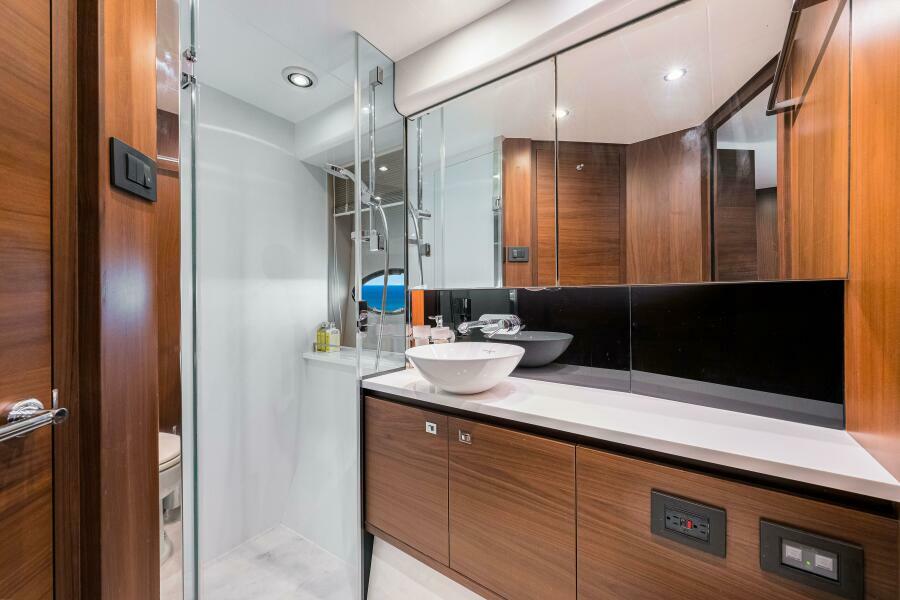 The main deck helm position provides exceptionally comfortable cruising. The well-equipped galley is located just aft of the helm with a sociable dining area adjacent. Below deck, full-standing headroom adds to the spacious ambience throughout the three cabins and full beam master stateroom, affording your guests with the luxury of space for their time on board.