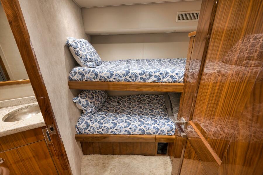 The interior showcases Viking’s signature walnut gloss finish with custom décor throughout, including custom Amtico flooring, brushed nickel hardware, upgraded mattresses, custom countertops, and abundant storage. Multiple social areas- the salon, dinette, enclosed bridge, mezzanine, and cockpit- make TORTA perfectly suited for extended fishing trips or relaxed cruising with guests.