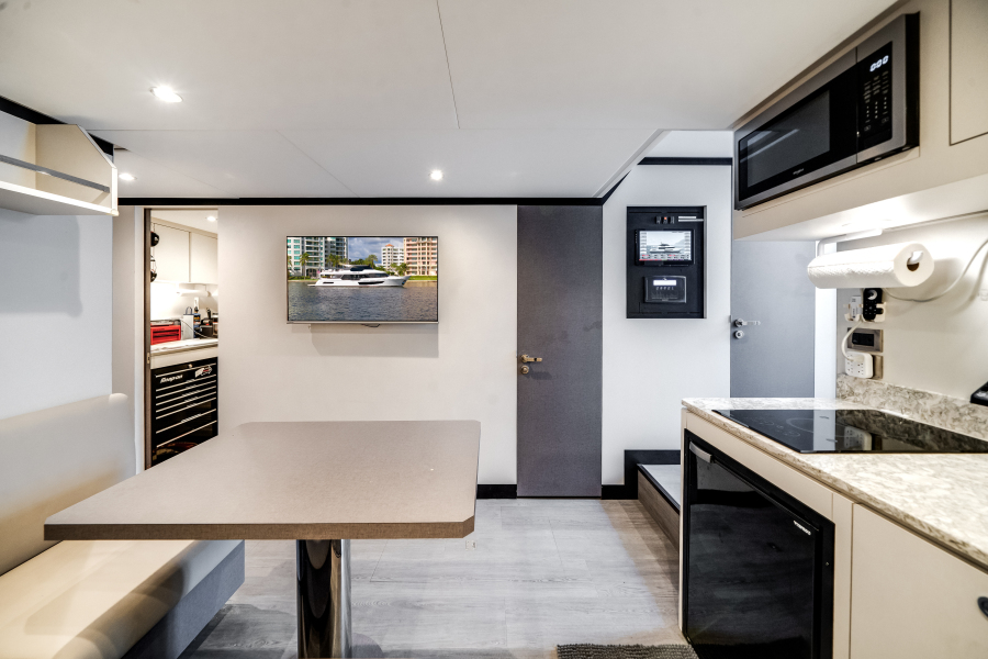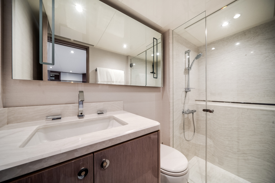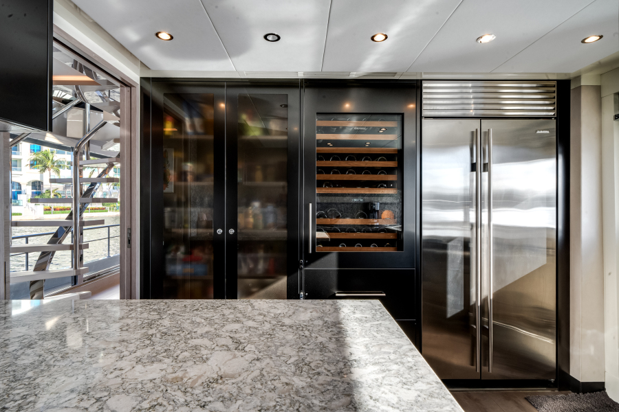 Carbon Copy includes a spacious on-deck master suite, offering the owner a private oasis of comfort and serenity. Thanks to our pioneering aluminum-beam engineering, we’ve achieved some of the most impressive, unobstructed window views available in a yacht of this size.