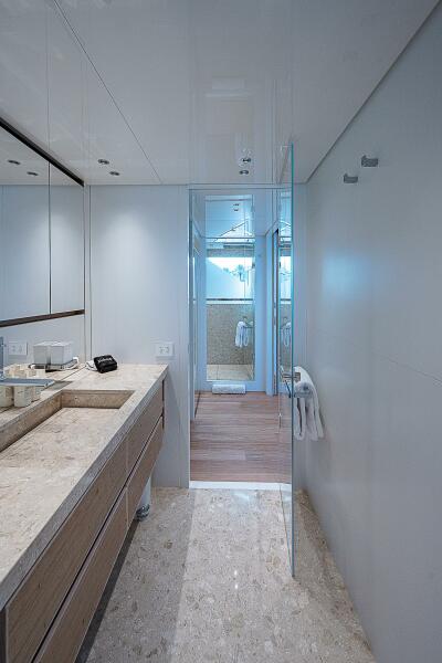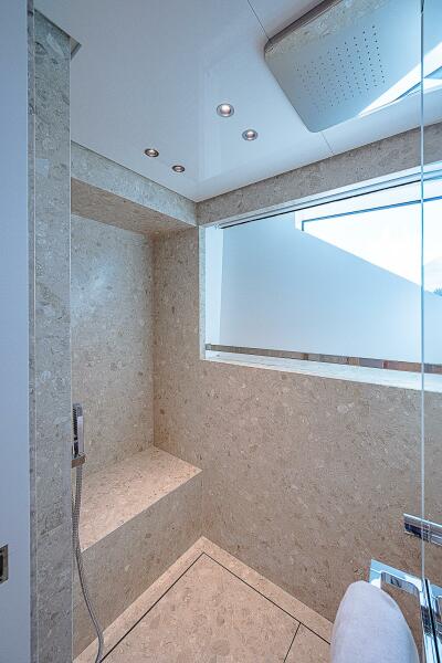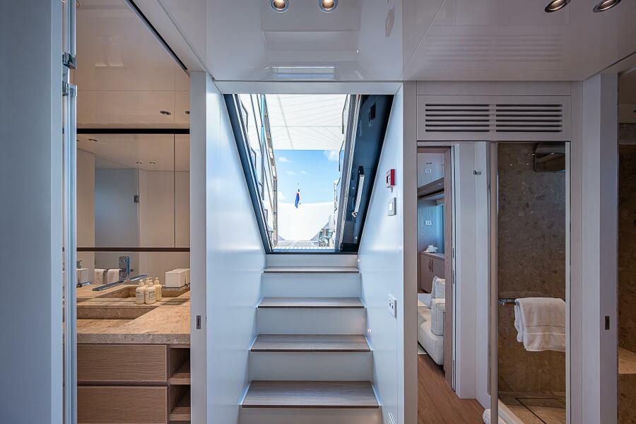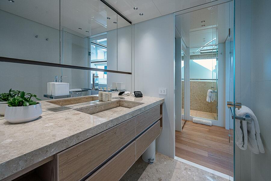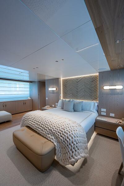 Step inside and you are welcomed by a custom interior by Marty Lowe, thoughtfully curated to feel both contemporary and timeless. Natural textures, bespoke furnishings, and a calming, sophisticated palette create a warm residential atmosphere, one that feels instantly inviting and entirely unique. This is a yacht designed to be lived on, not just admired.