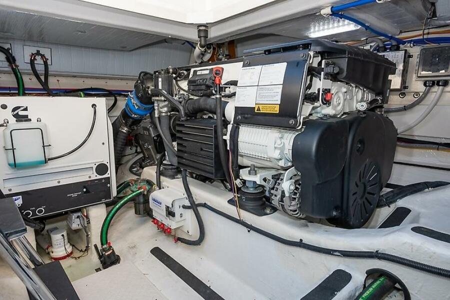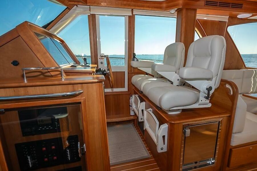 Highlights include a spacious salon with two banks of seating over six feet in length and a half-up galley that incorporates all the amenities of a modern kitchen without wasting an inch of precious storage volume. Below deck, a versatile hybrid lounge functions as guest berth, private retreat, or home office, depending on her owners? needs. Her master stateroom is iconic Sabre, featuring an island berth and numerous storage compartments, all in warm American cherry. Finally, an adaptable utility room beneath the salon sole provides space for various supplemental storage and appliance solutions, including a side-by-side washer and dryer, wine cooler, or storage lockers.