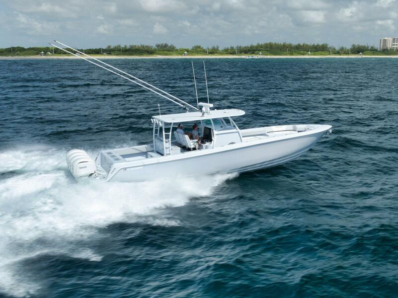 As Contender’s flagship and largest boat to date, the 44ST excels in performance, quality, fishability, and reliability. The 44ST is designed and engineered for speed and bluewater competitive sport fishing with a proven double-stepped hull and reverse chines perfectly balanced for the soft, dry ride and seakeeping ability Contender is renowned for. With a 44 ft. length and 12 ft. beam, weighing 19,600 lbs., and configured with triple or quad Yamaha outboards (up to 2000 hp), the 44ST is powerful and stable for running in all sea conditions, safely and faster than other center consoles in her class. It offers a stable platform for the gap tower to see fish comfortably.