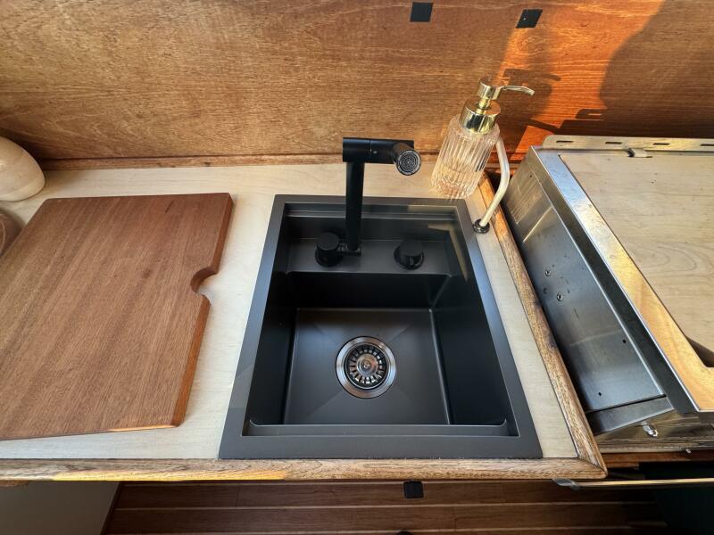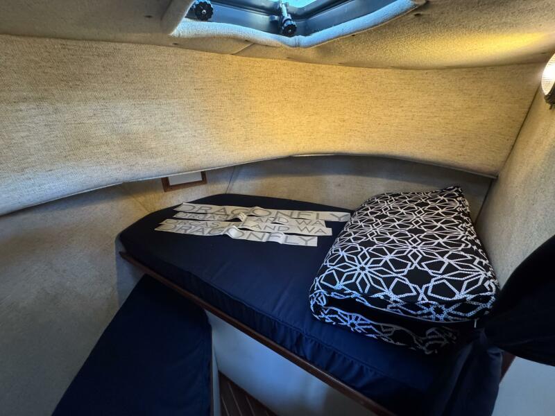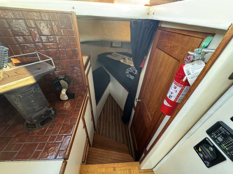Once on board, you’ll find warm woodwork throughout, a little woodstove perfect for cozy mornings at anchor. New soft goods adorn the seats and V-berth, featuring memory foam, and a freshly upgraded galley equipped with a small fridge, propane stove with oven, a spacious pantry, new countertop, galley sink, and faucet.