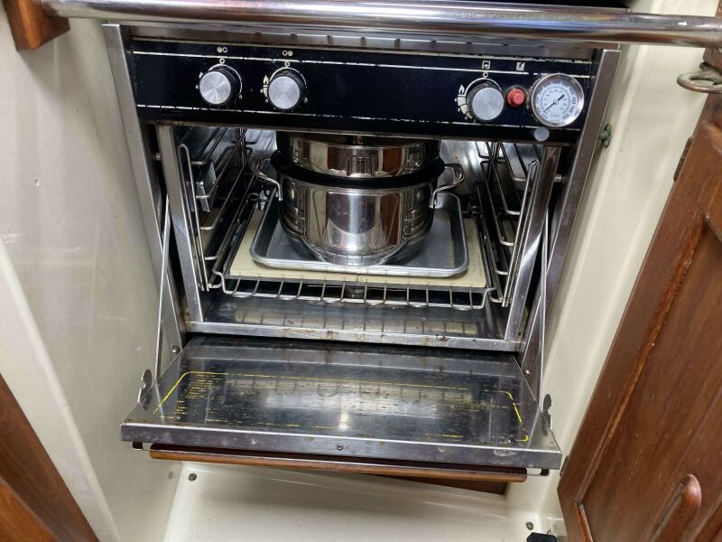 The U-shaped galley is to port offering lots of storage and counter space including an overhead cabinet. A Technautics brand refrigerator-freezer, a Force 10 stove w/oven and deep double Stainless steel sinks w/hot & cold pressure water make meal preparation offshore or at the dock a breeze. There is also a manual foot pump at the sink. Across from the galley is the forward facing nav station. It has a large teak opening chart table, the master electrical panel and navigational equipment.