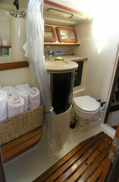 Powered by a 38hp Yanmar 3JH2E (1,100 hrs), she carries a fully battened mainsail, two genoas, and a cruising spinnaker - ready for confident sailing in a variety of conditions. Electronics include an ICOM VHF with remote mic, Garmin chartplotter, Raytheon EV100 autopilot, and AWI/SWI indicator for reliable navigation. Her open cockpit is designed for both versatility and relaxation, featuring a folding teak table, walk-through transom, swim platform with hot/cold shower, and a dodger with attached bimini - perfect for sailing in any weather.