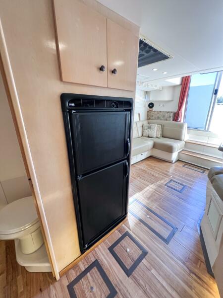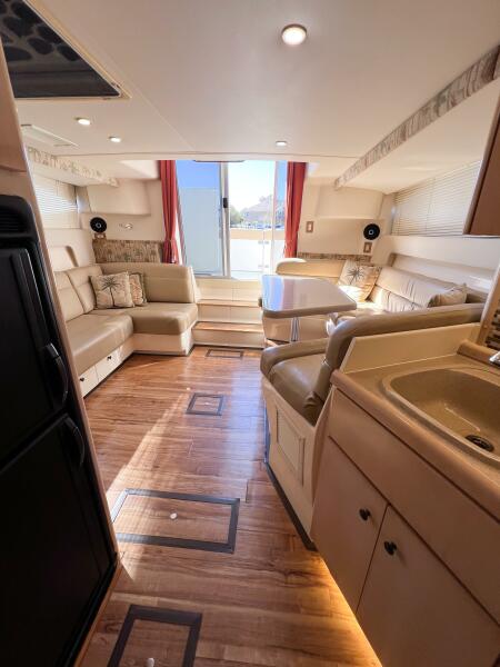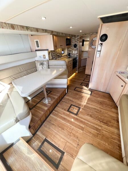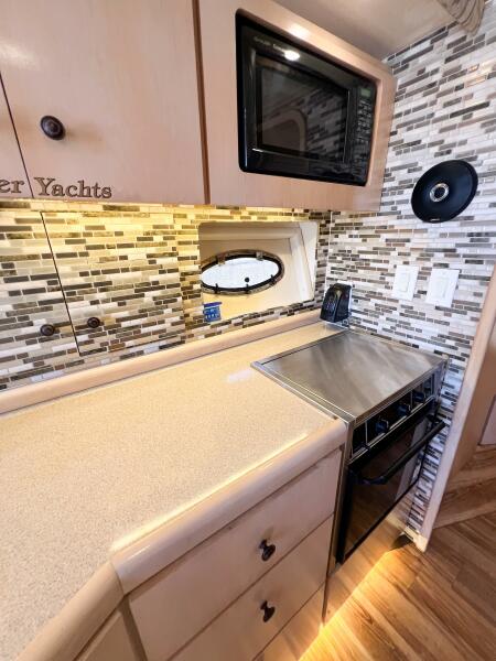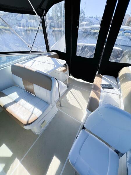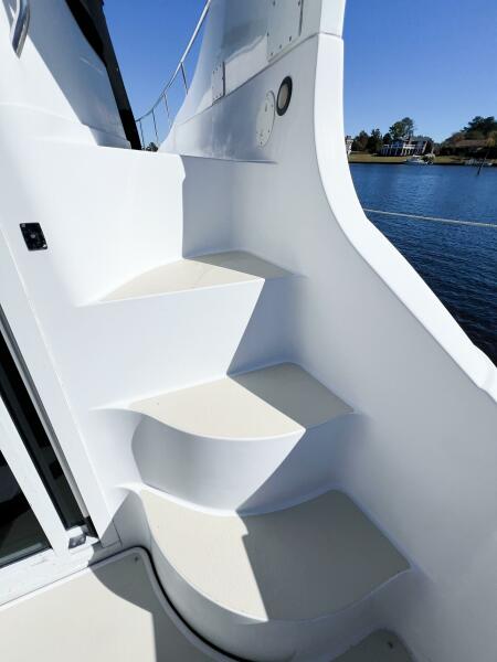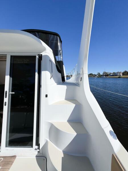 Topside, her easy molded steps (no ladders!) lead to a spacious flybridge with wraparound seating for a crowd. The open cockpit is perfect for lounging, docktailing, or casting a line.