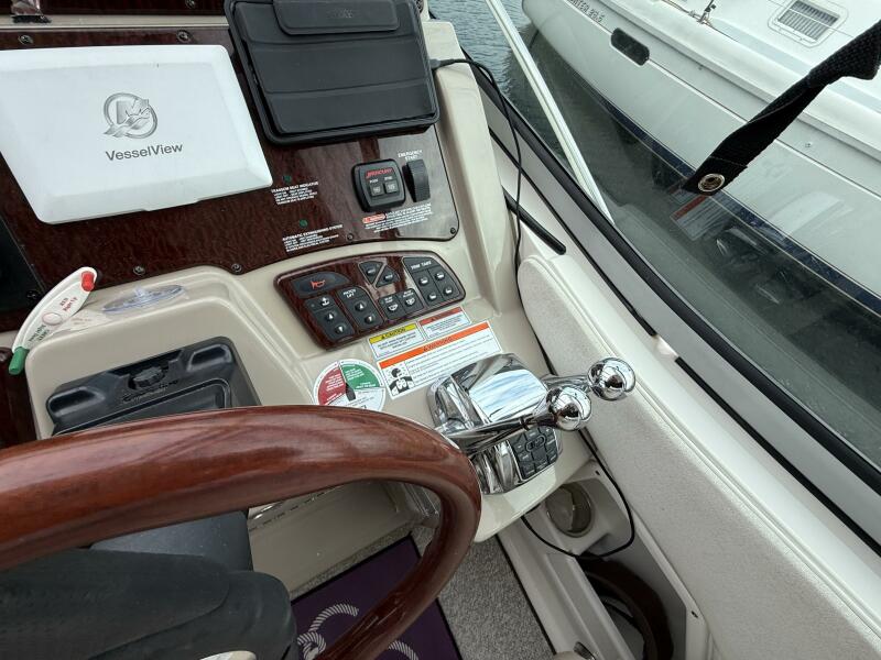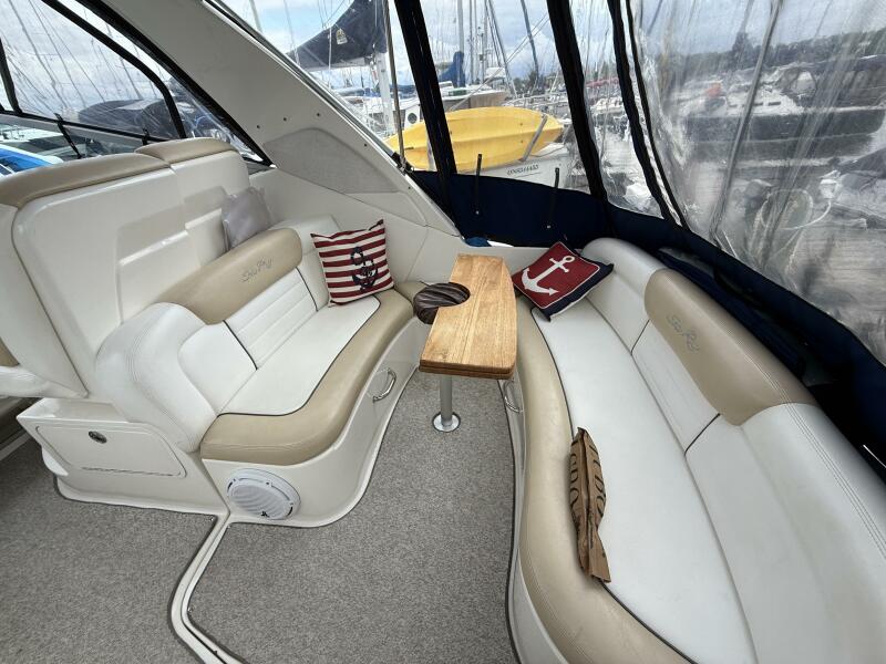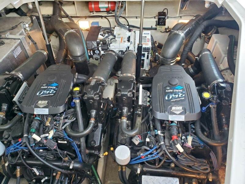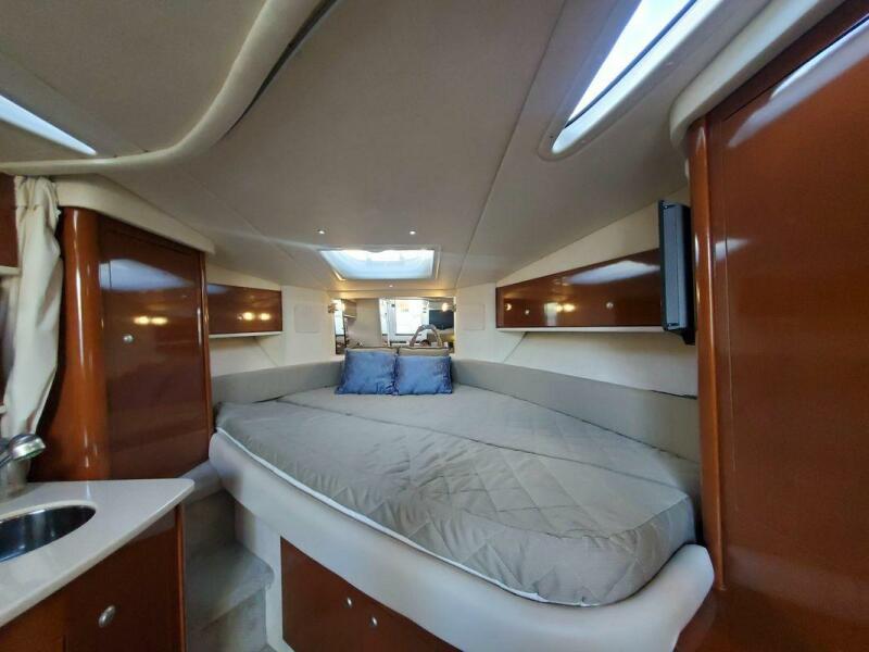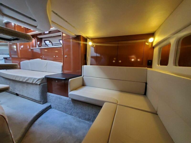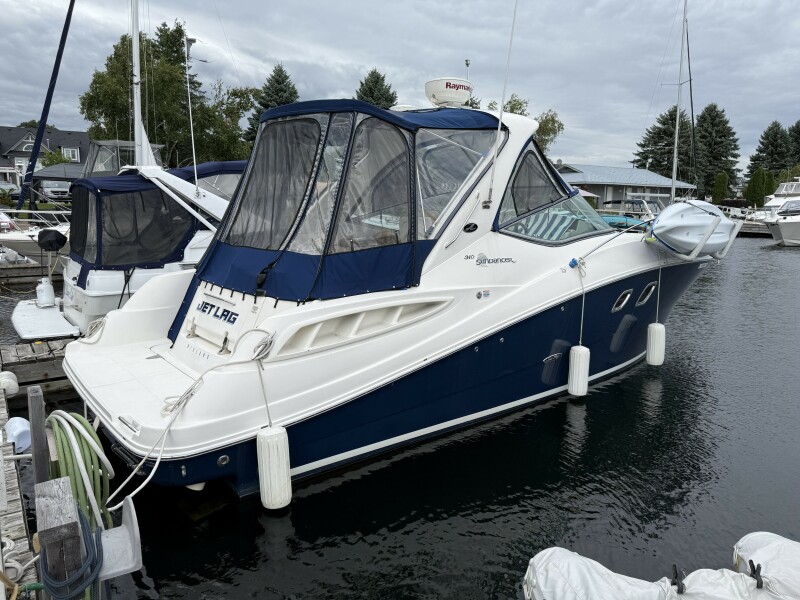 Well-maintained family cruiser with twin 300 hp MerCruiser 350 MAG MPI V8s and V-drives, offering reliable performance and easy handling. Equipped with air conditioning/heat, generator, solar panels, and full shore power. Features a bright, comfortable interior with two cabins, sleeping for five, a well-equipped galley, and a VacuFlush head. The cockpit includes a refrigerator, foldable teak table, and custom transom sunshade. Clean canvas with new bow windows and a current 2025 survey make this a turnkey boat ready for her next owners.
