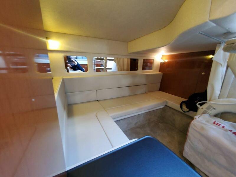 Salon: Single bench that pulls out to a single berth, six storage cabinets,and a removable dining table stored under the forward berth when not in use.