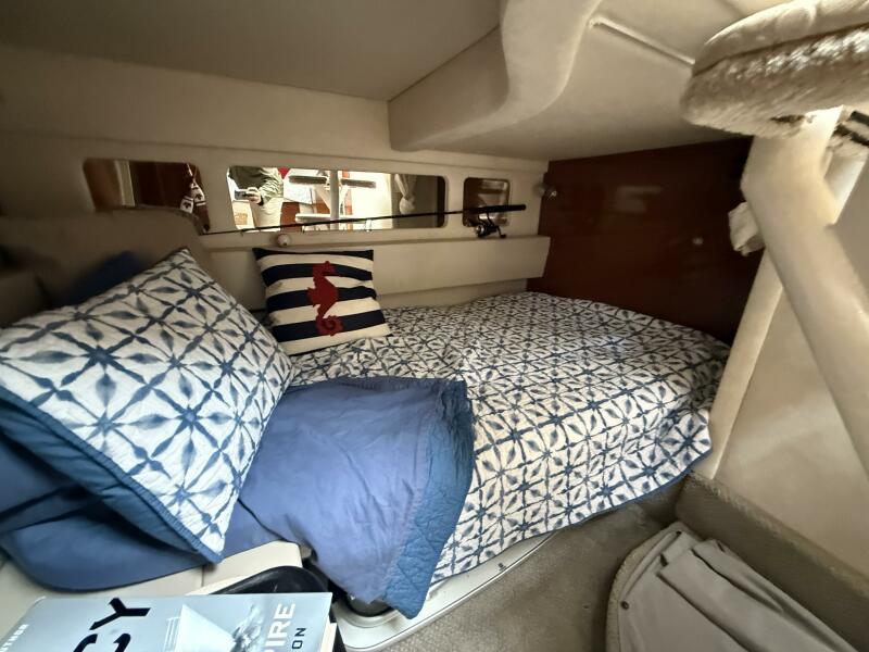 Forward Cabin: Angled berth for two, overhead hatch with built-in screen and shade, privacy curtain, LCD TV with DVD, hanging locker, foam mattress.