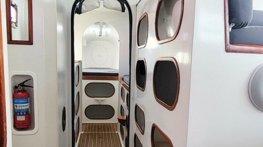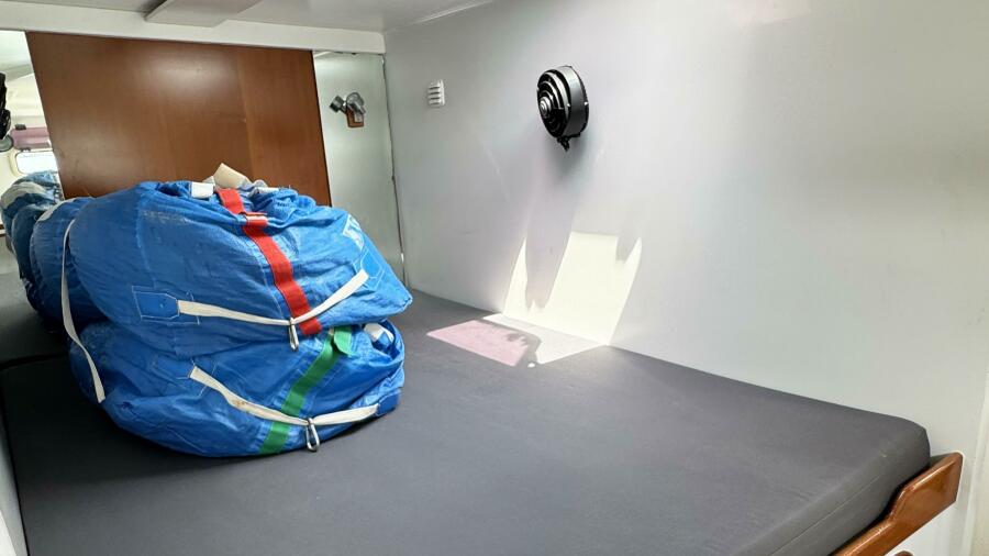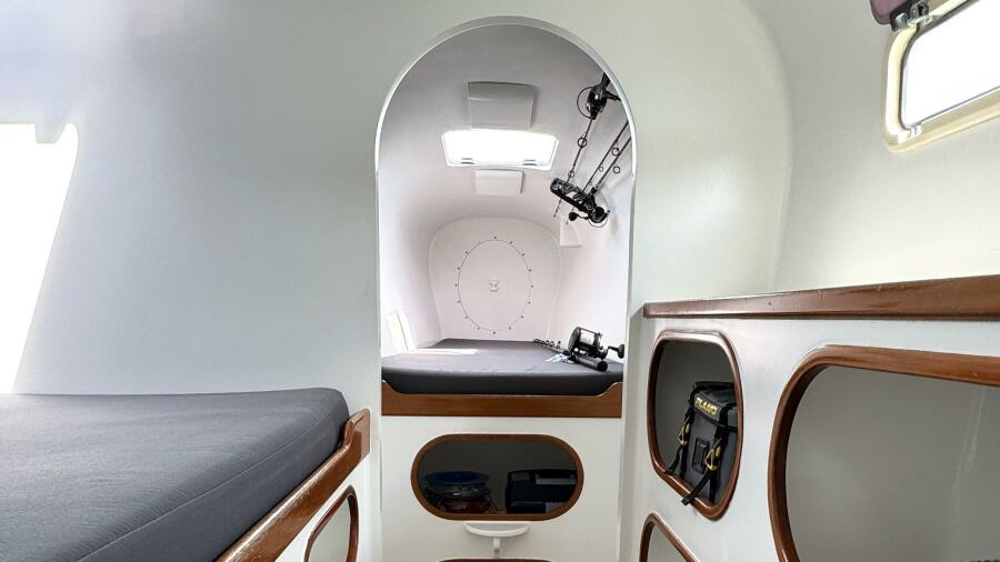 Each hull offers two double cabins forward, a single berth for storage or additional sleeping space, and a bathroom aft in both hulls, comfortably accommodating six guests, with the option to sleep two more in the saloon area.