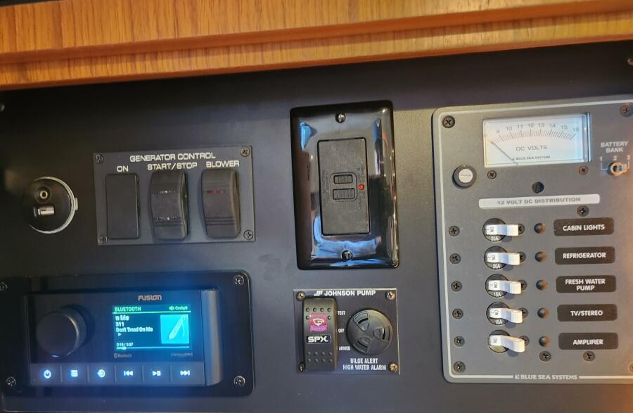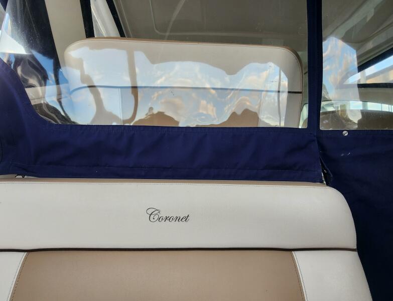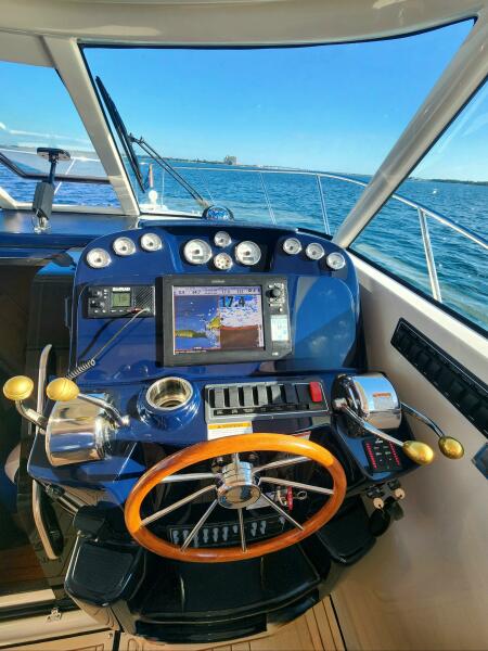 One level main deck access to the enclosed helm area offers seating and table portside with a Kenyon electric grill sink combination bar with refrigerator to starboard. The hardtop has a manual sliding sunroof with superior sliding track and lock for letting the sunshine in or keeping the weather out.