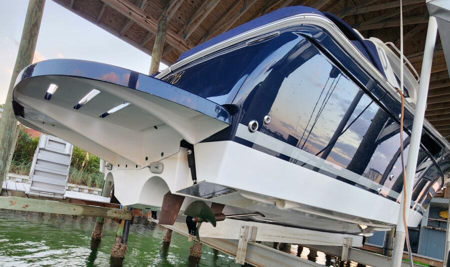 The moment you step aboard the teak inlaid fiberglass swim platform on this beautiful flag blue hull, you feel the full beam of welcoming cockpit seating and signature soft Marine Mat flooring. With an on center transom gate and teak handrail, Tiara has made a statement of style and safety for up to 8 guests.