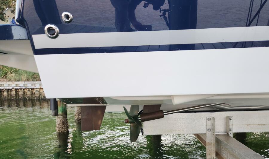 Teak access steps guide you out of the cockpit safely to walk forward for bow access with a stainless rail and molded nonskid walkway.