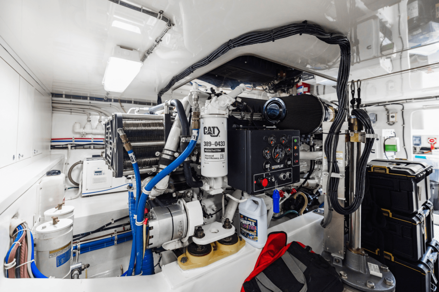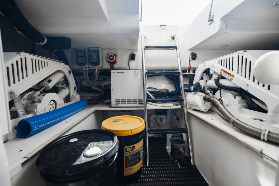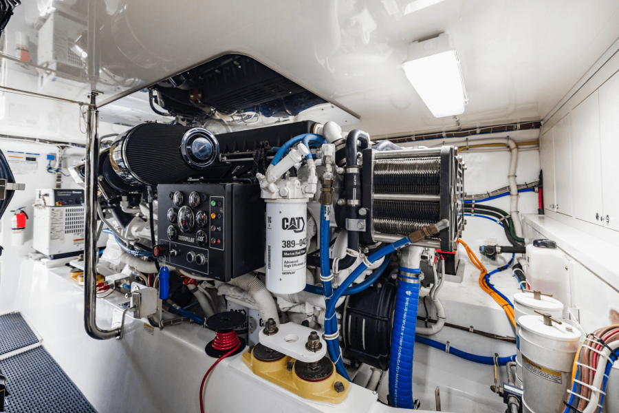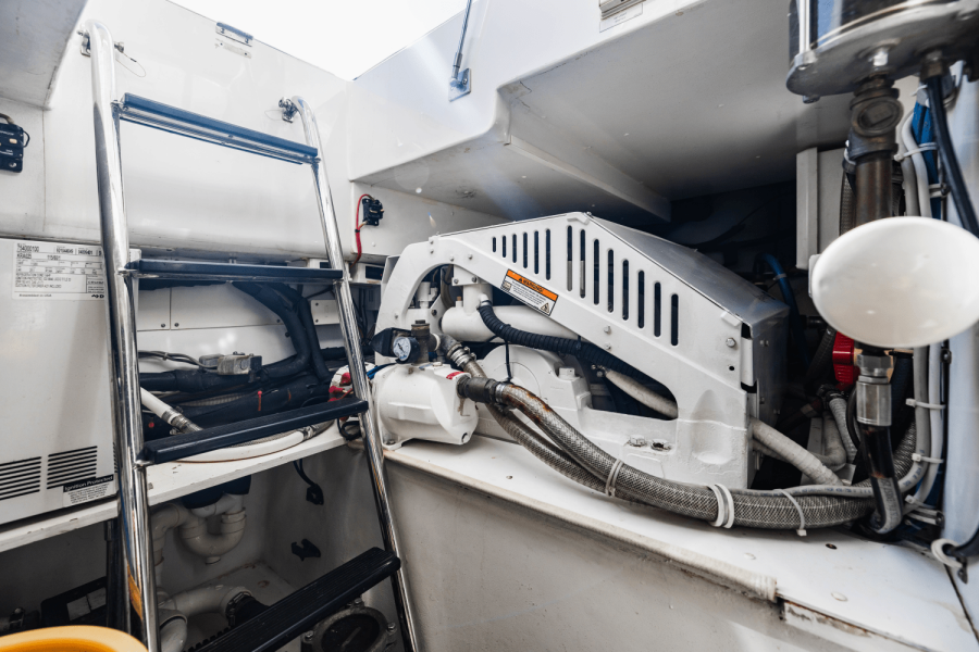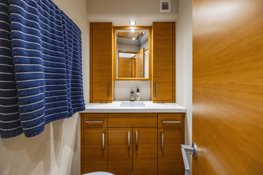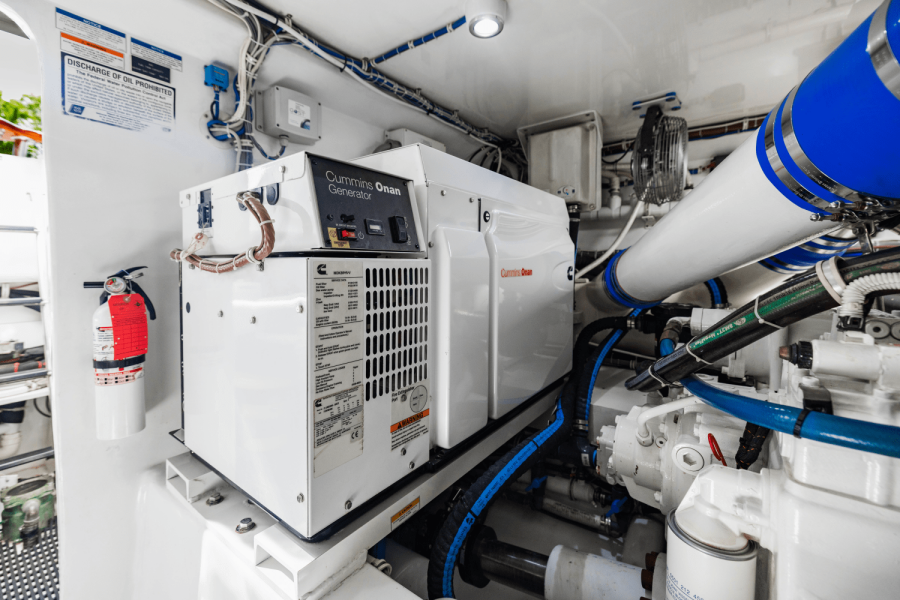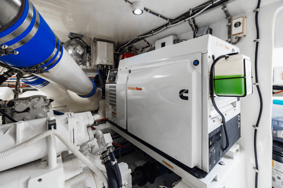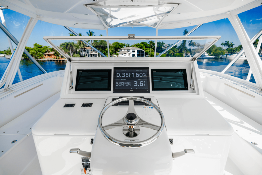 Inside, the salon and galley offer a bright, open layout with large windows that fill the space with natural light. Below deck, a central companionway leads to four staterooms and three heads. A stacked washer and dryer is conveniently located in the hallway. The open flybridge features excellent 360-degree visibility, rod holders aft, generous forward seating with storage beneath and ⅔ Isinglass enclosure.